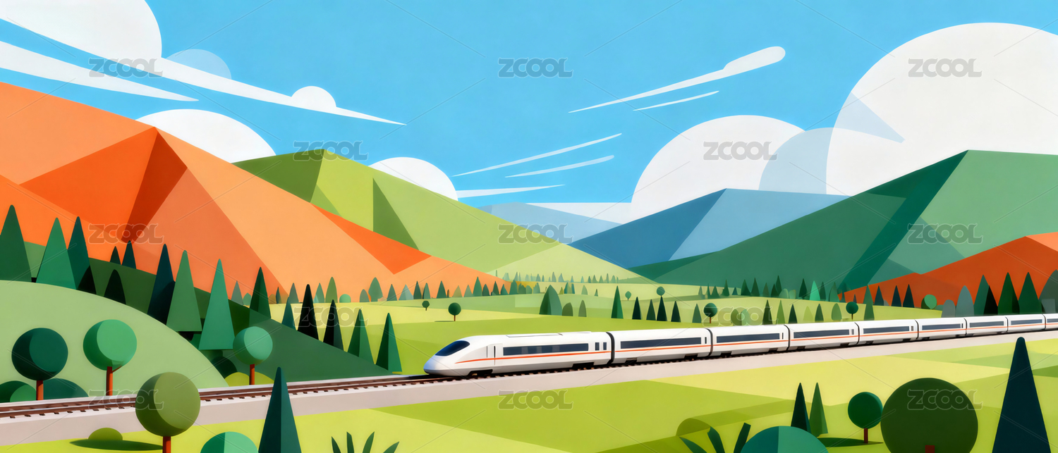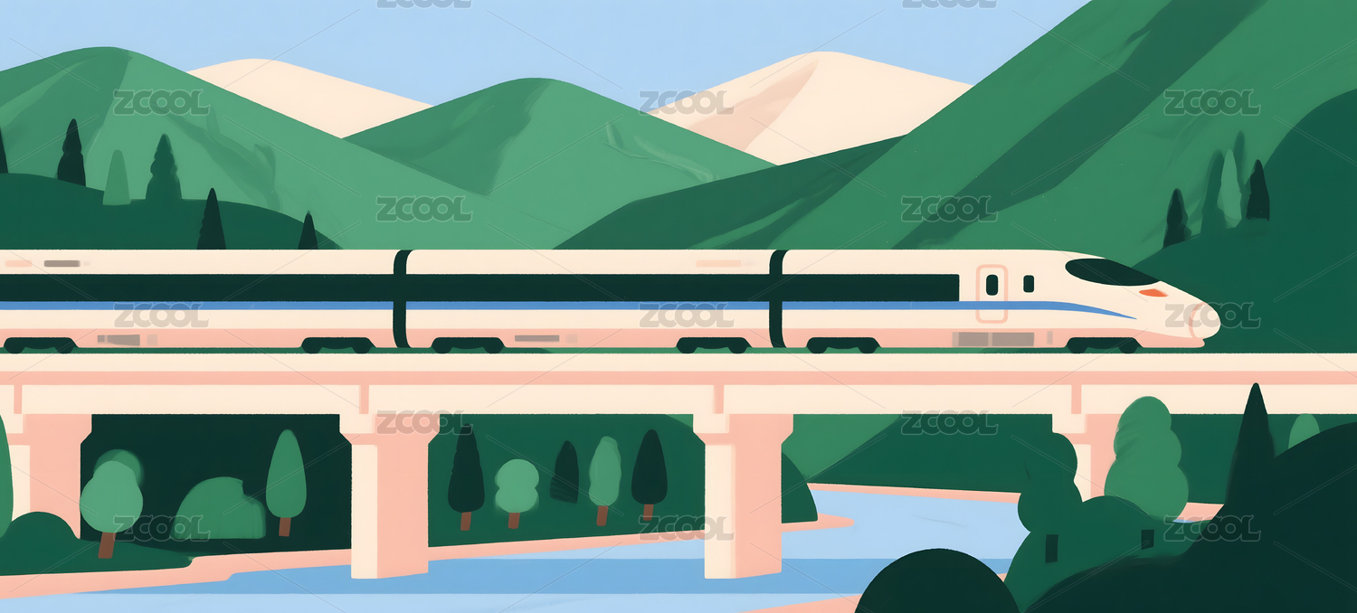 雪山,高铁,动车,绿色田野,山脉,蓝天,乡村小屋,铁轨,插画,风景