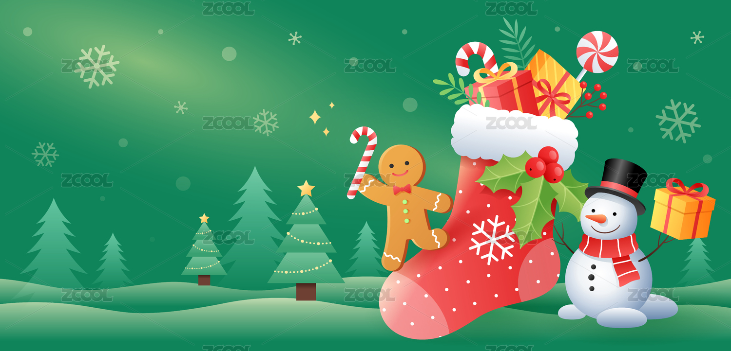 圣诞袜和礼物雪人姜饼人等矢量插画横版