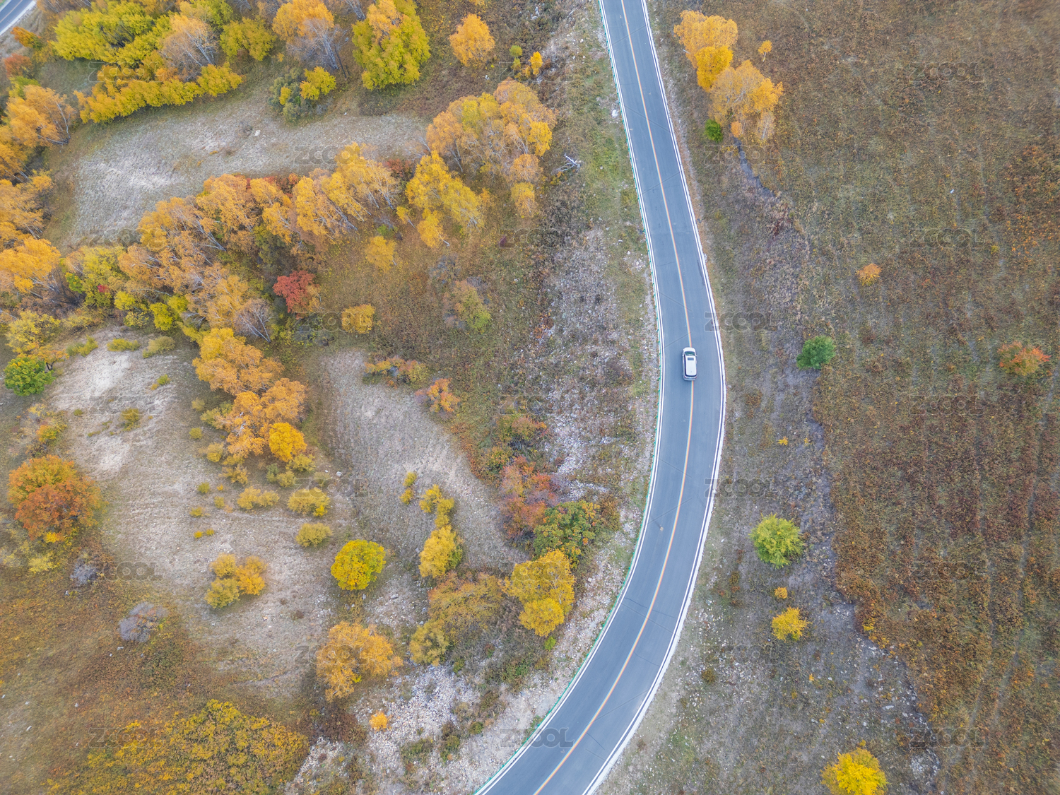 航拍中国新疆喀纳斯的公路穿过秋天金色森林