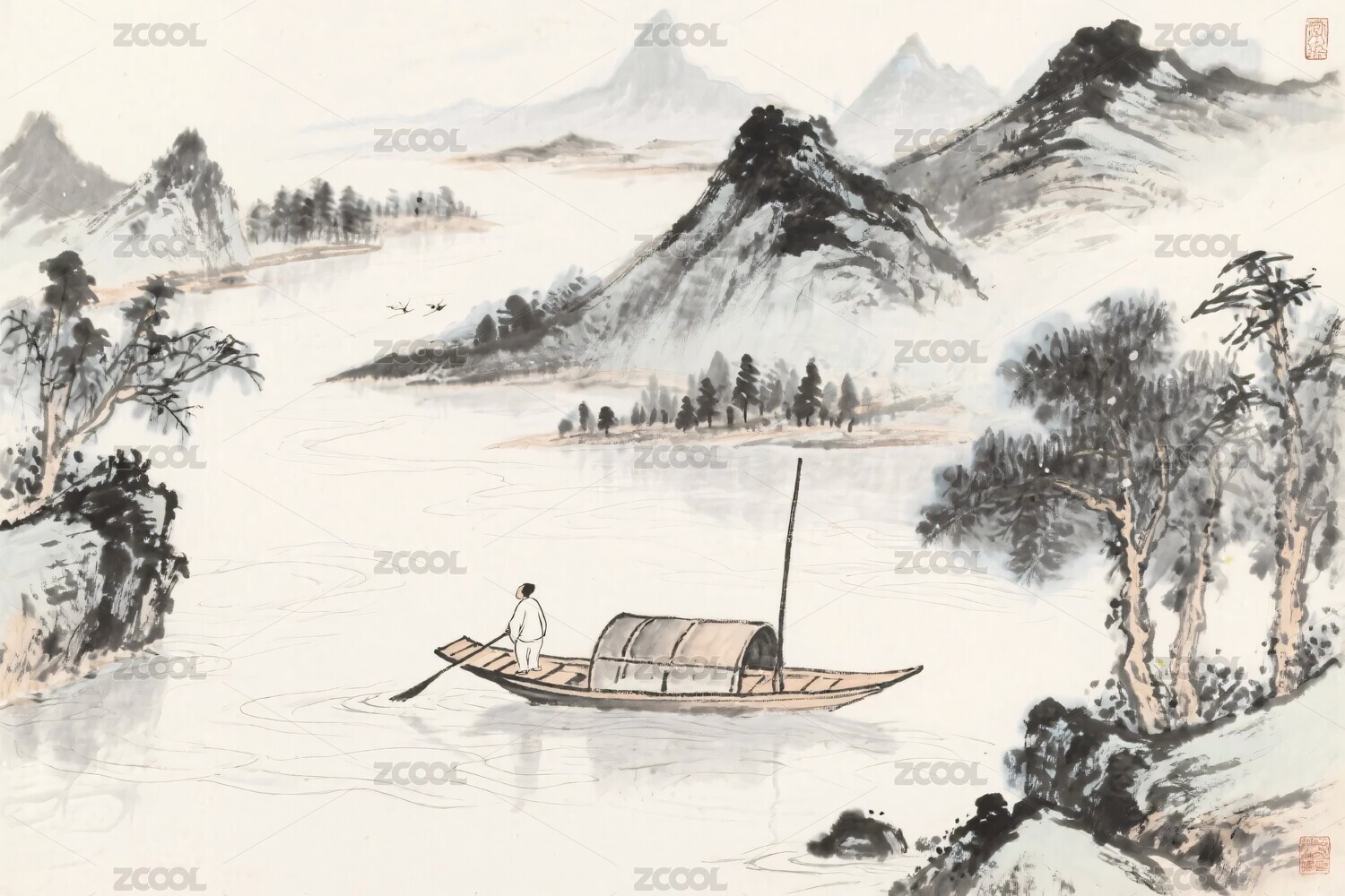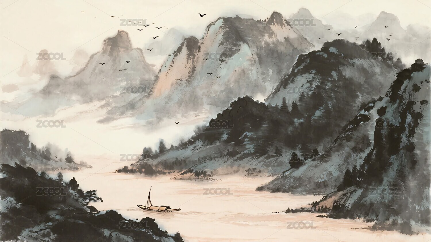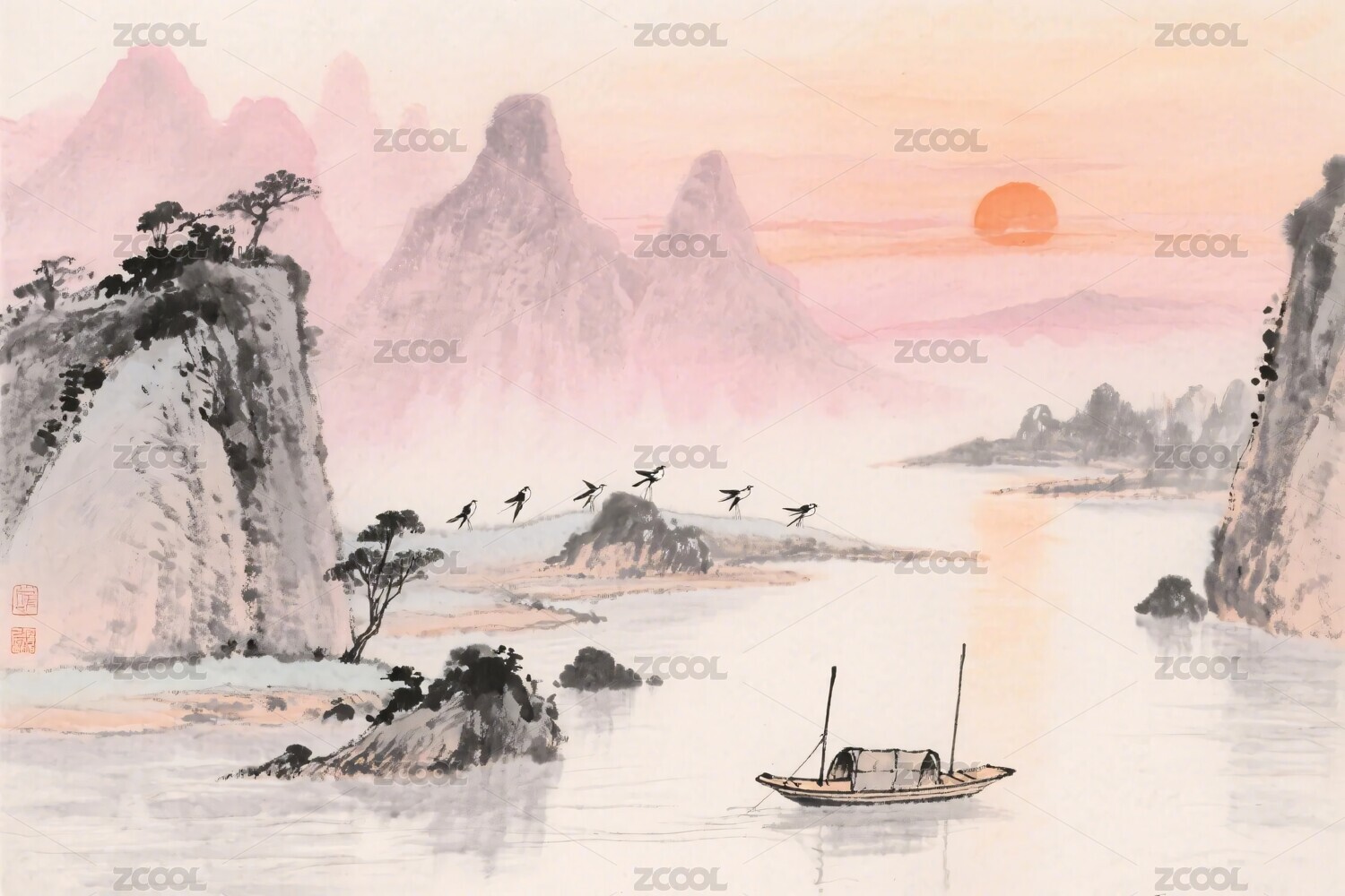 水墨画,山水,河流,小船,飞鸟,太阳,国画,风景,插画,传统