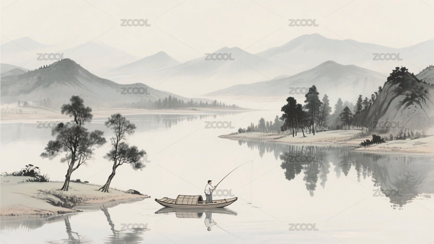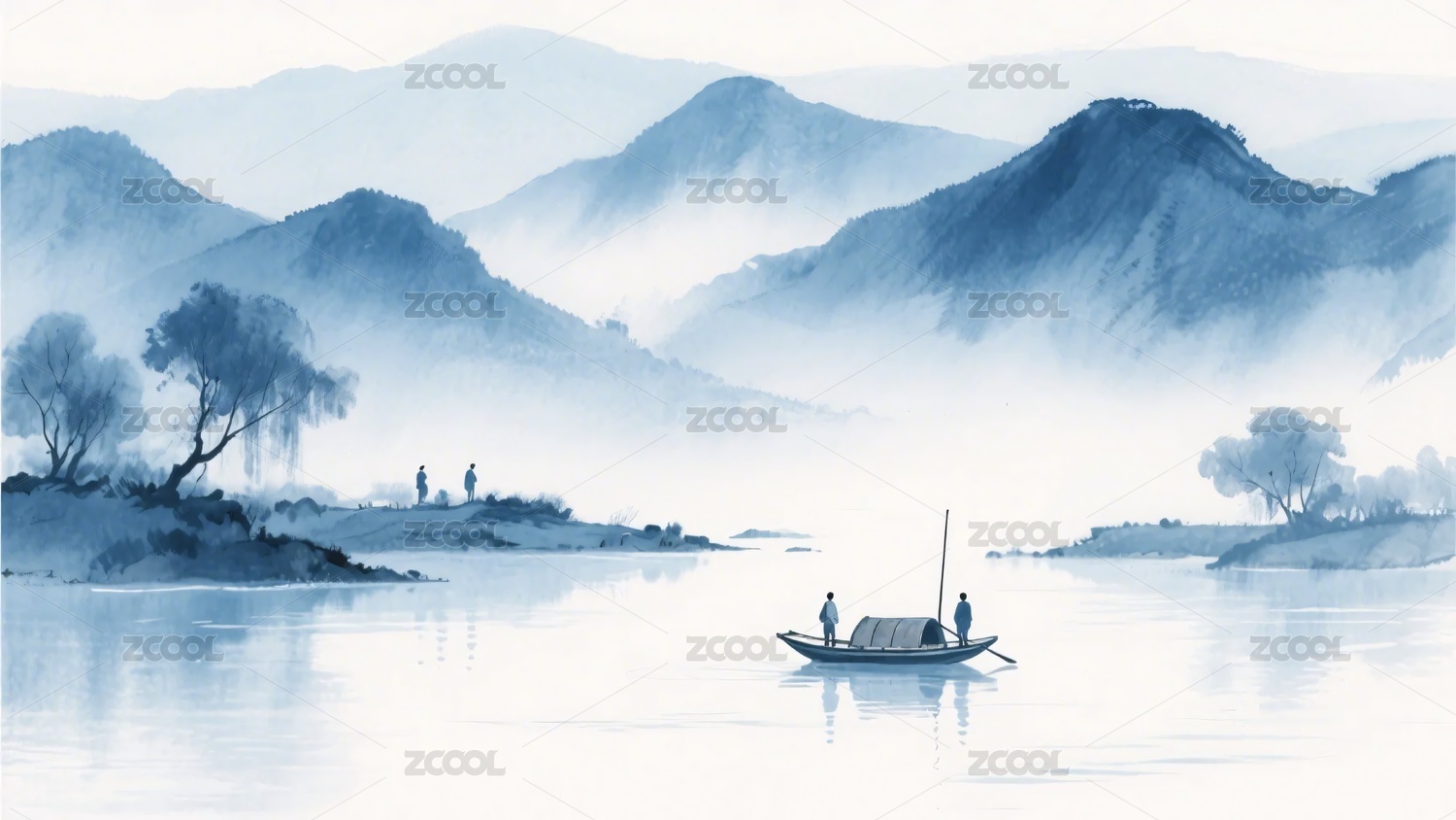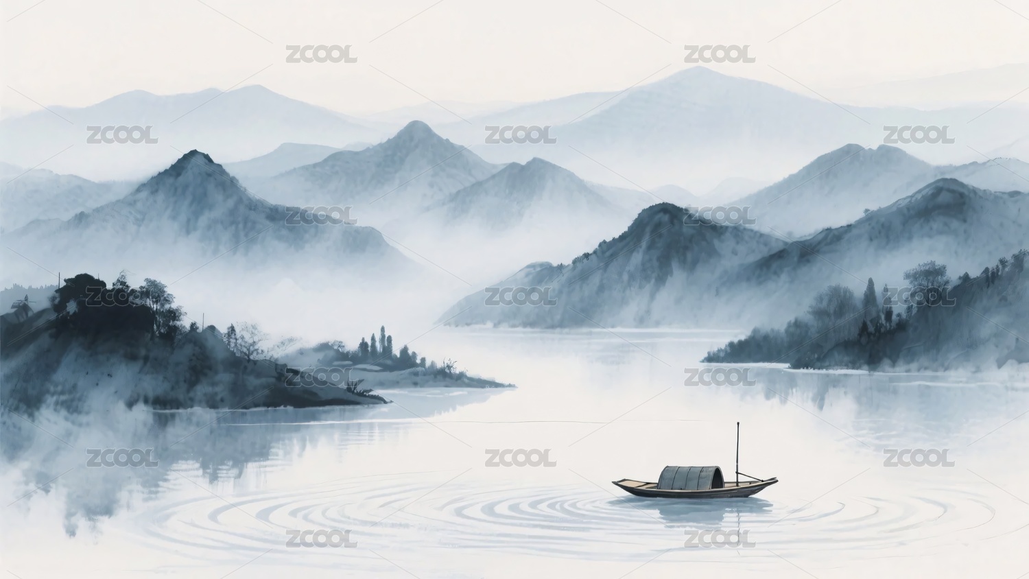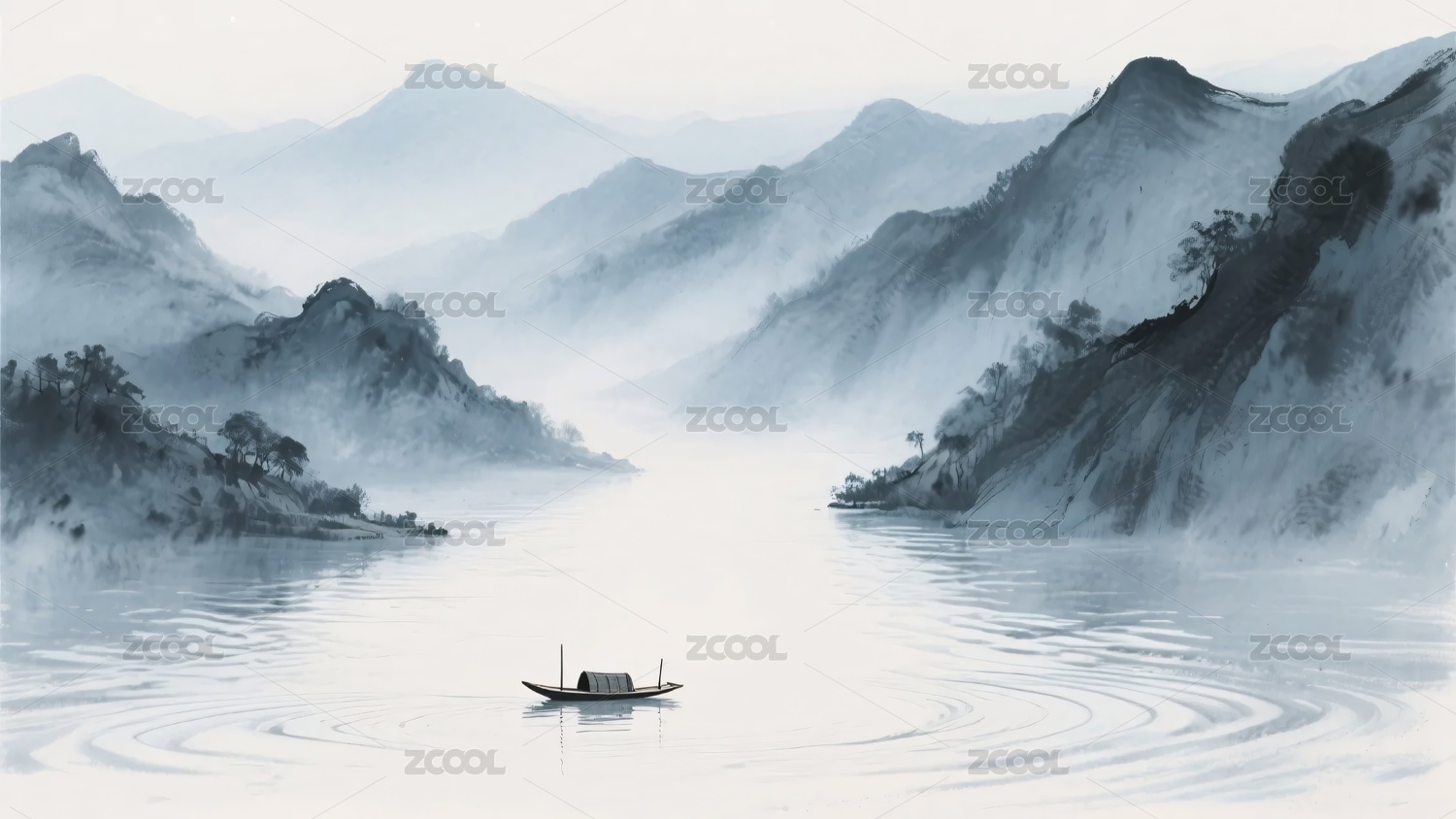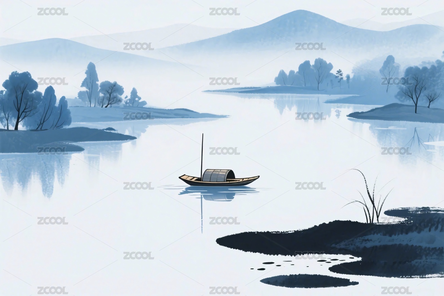 山水,小船,水墨,河流,树木,山峦,插画,东方美学,国风,风景