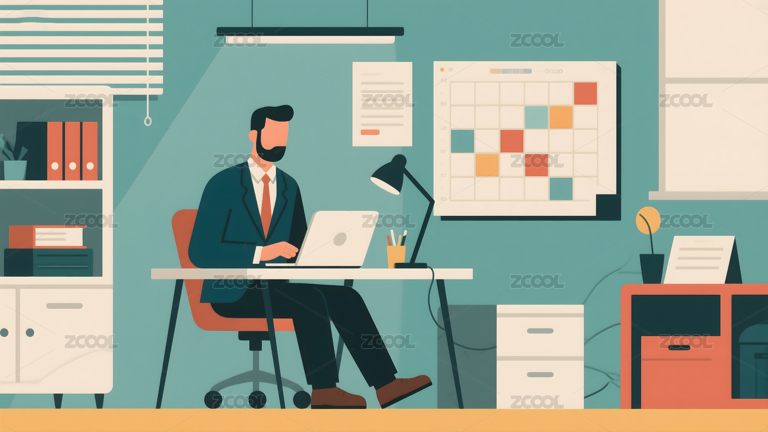 身穿西装在电脑前工作的男人侧面扁平肌理风插画
