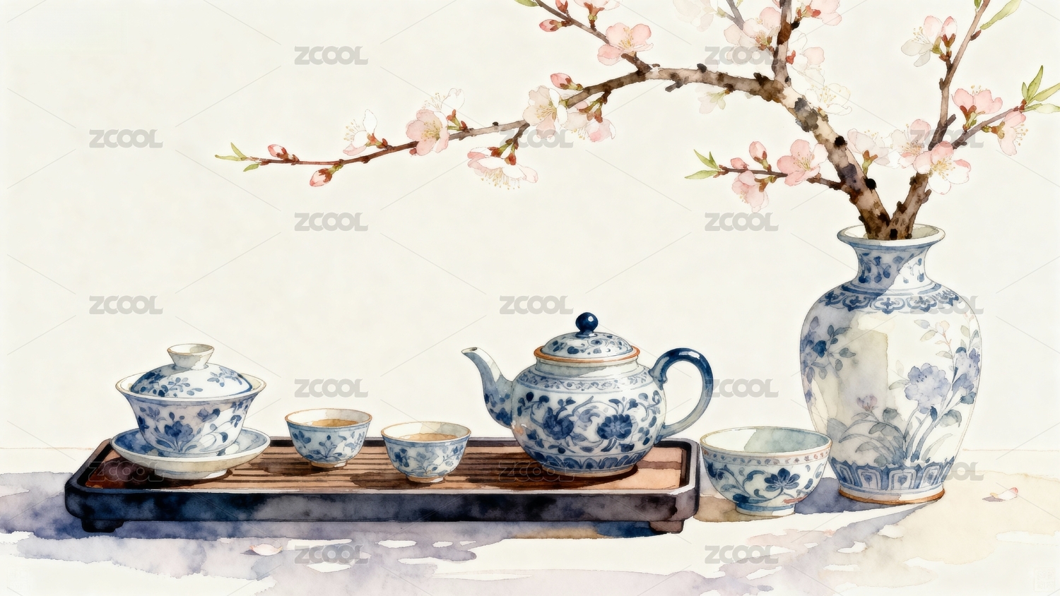 青花瓷茶具与梅花枝静物画