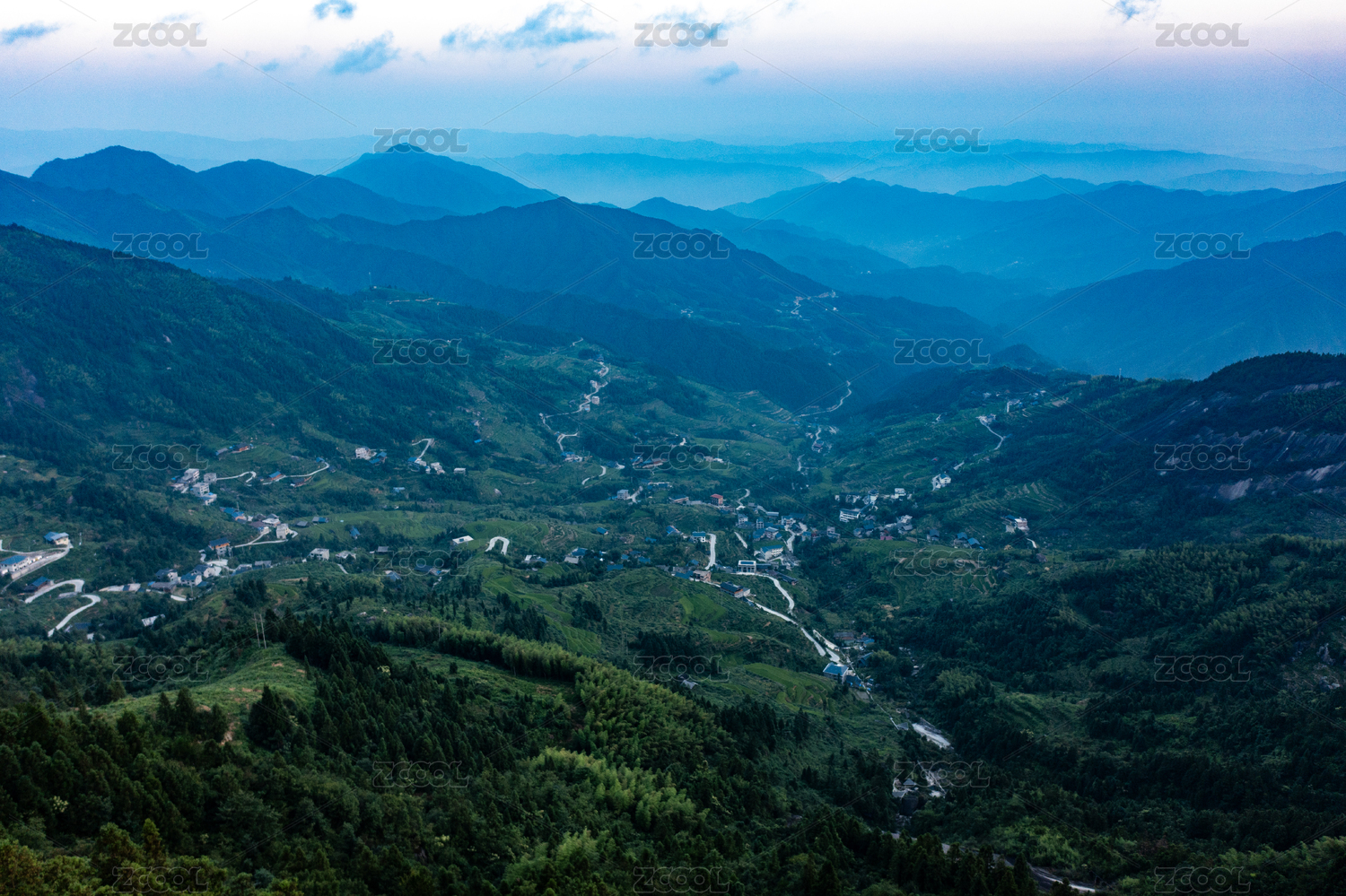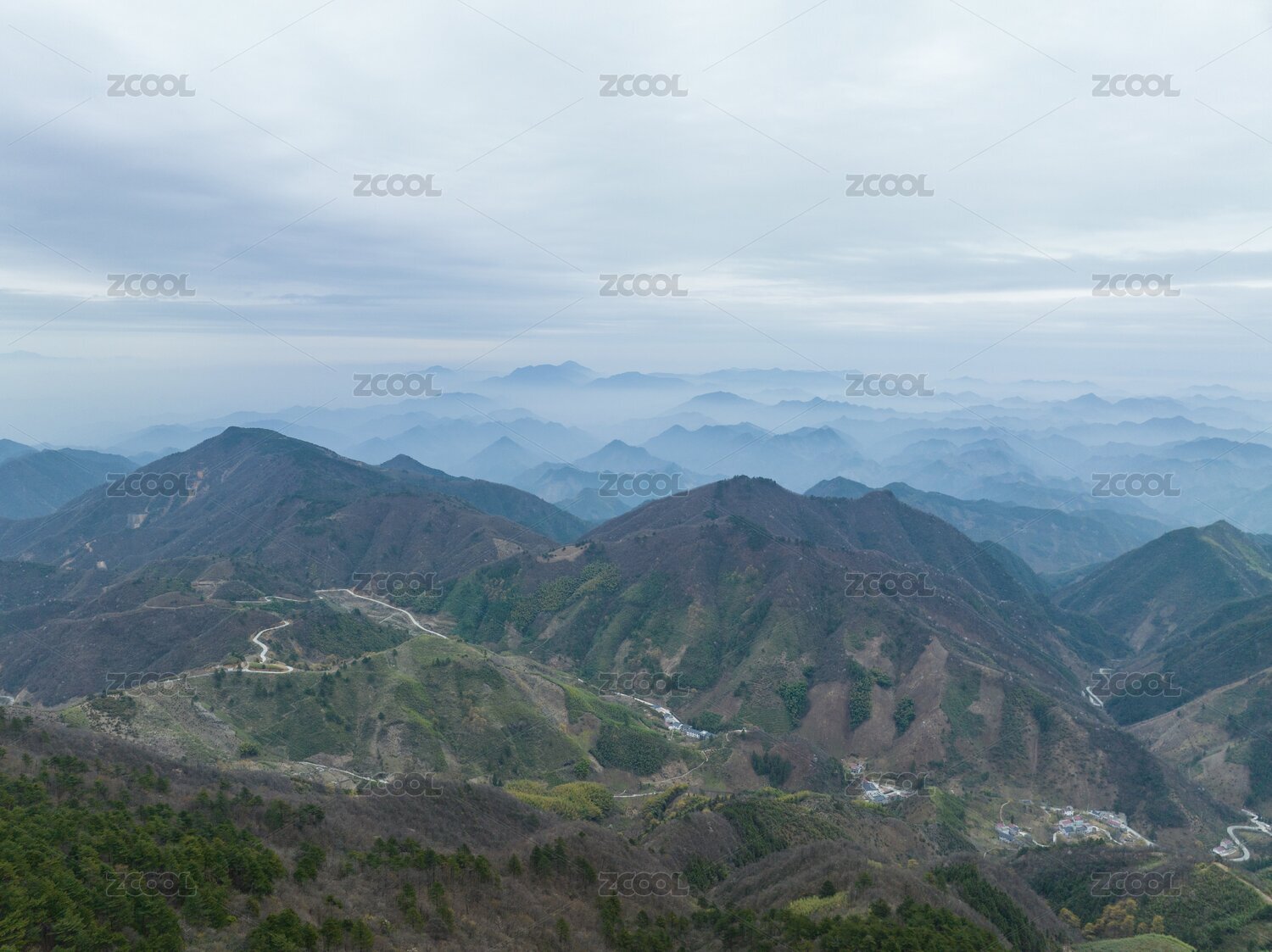 重庆云龟山山间晨雾下的青山连绵与村庄、道