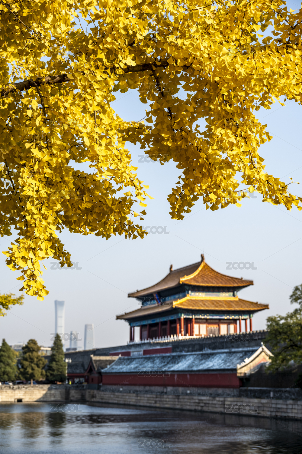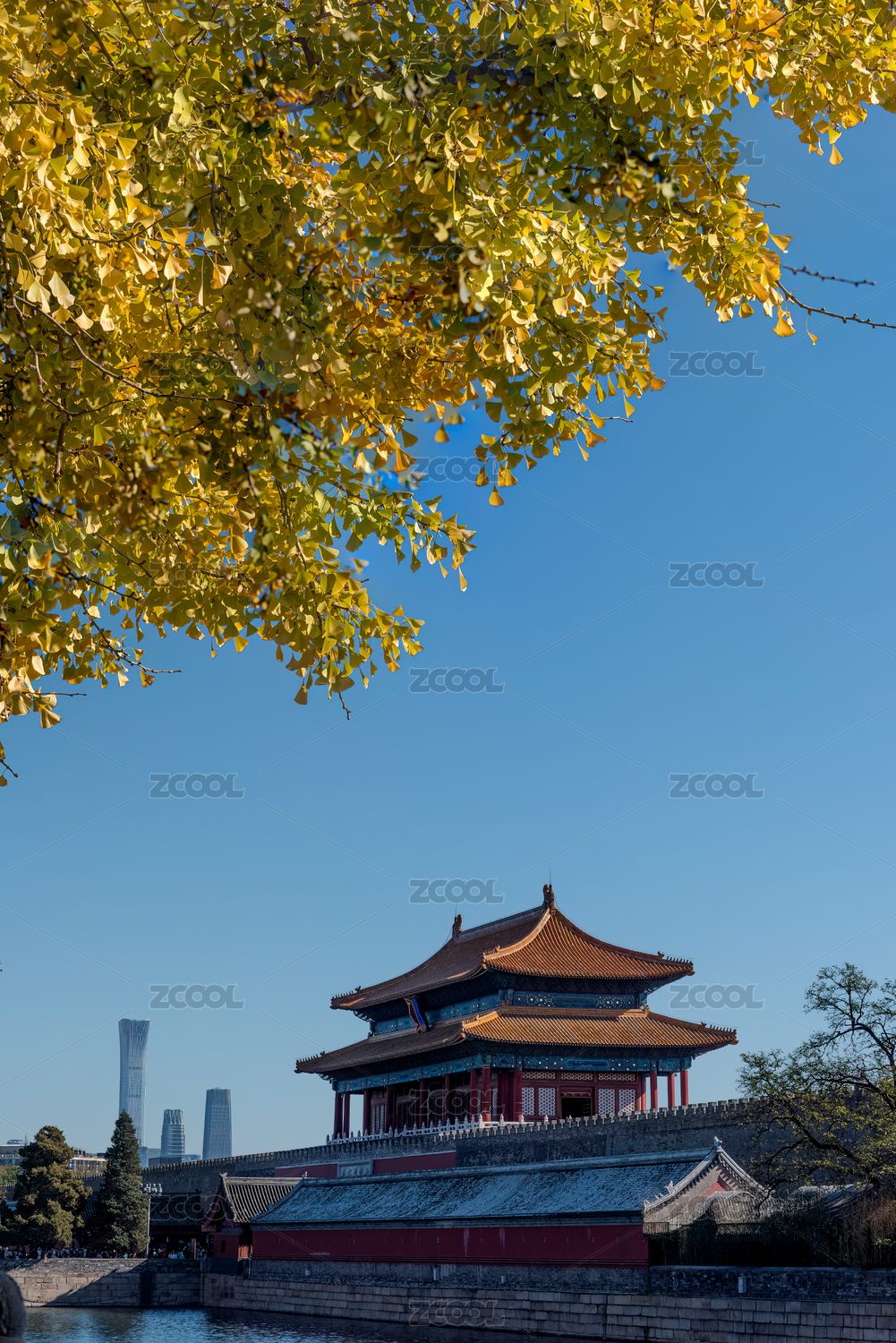 北京故宫护城河看金黄树叶、神武门和中国尊