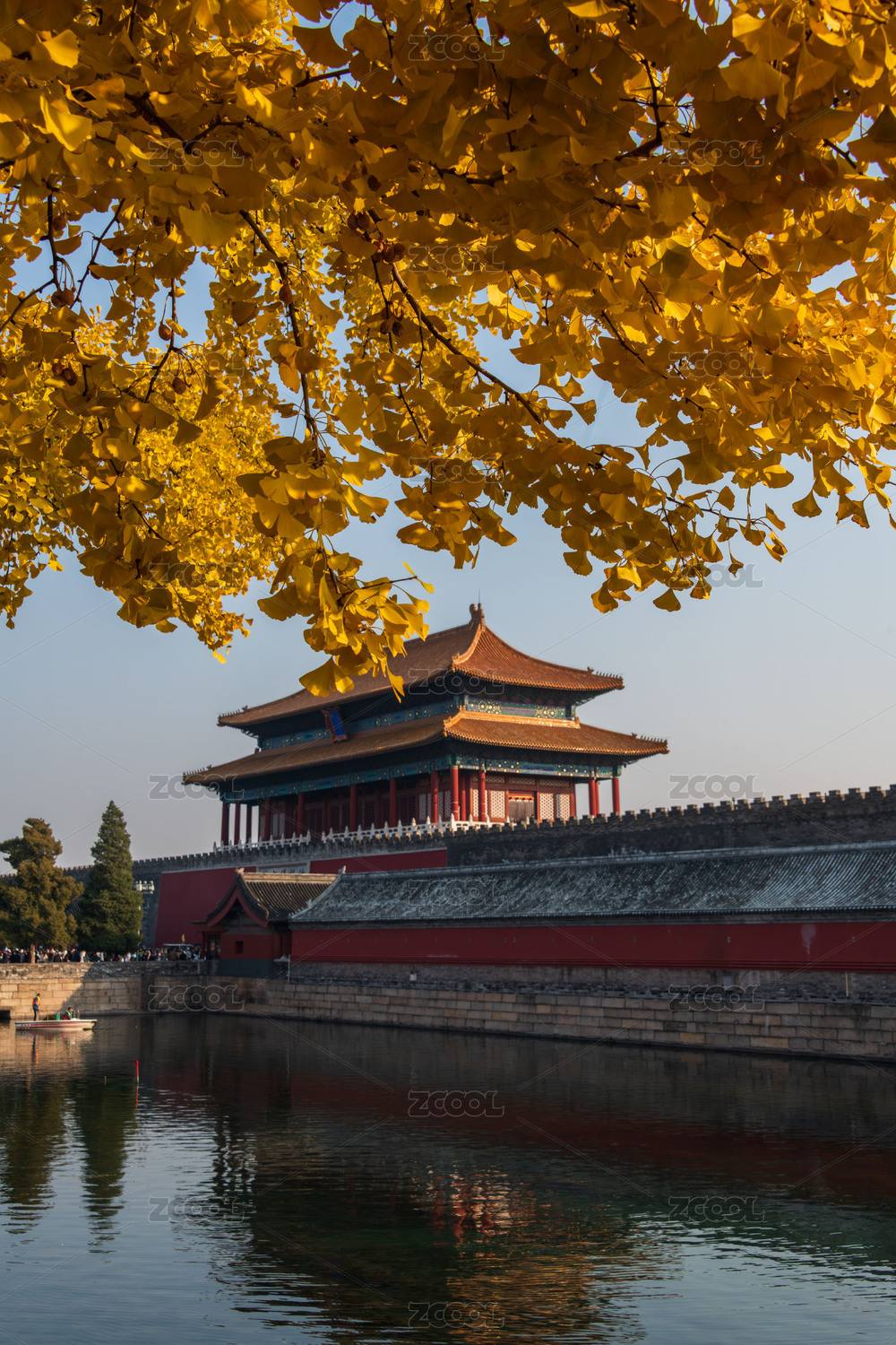 秋天中国北京故宫神武门和金黄色的的银杏叶