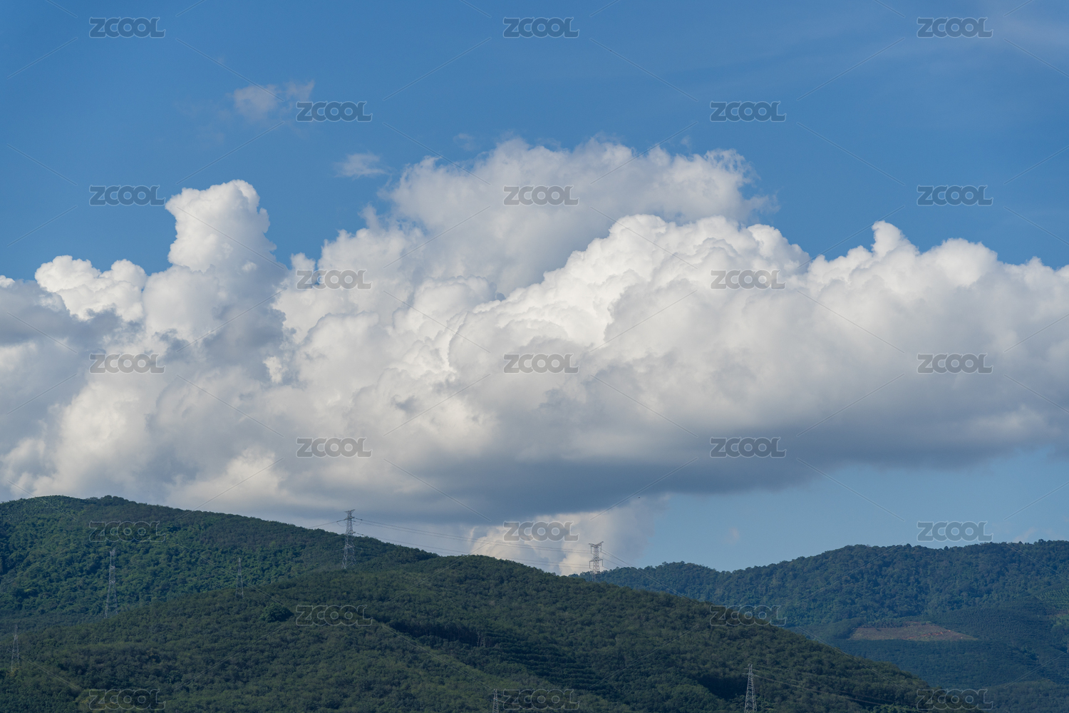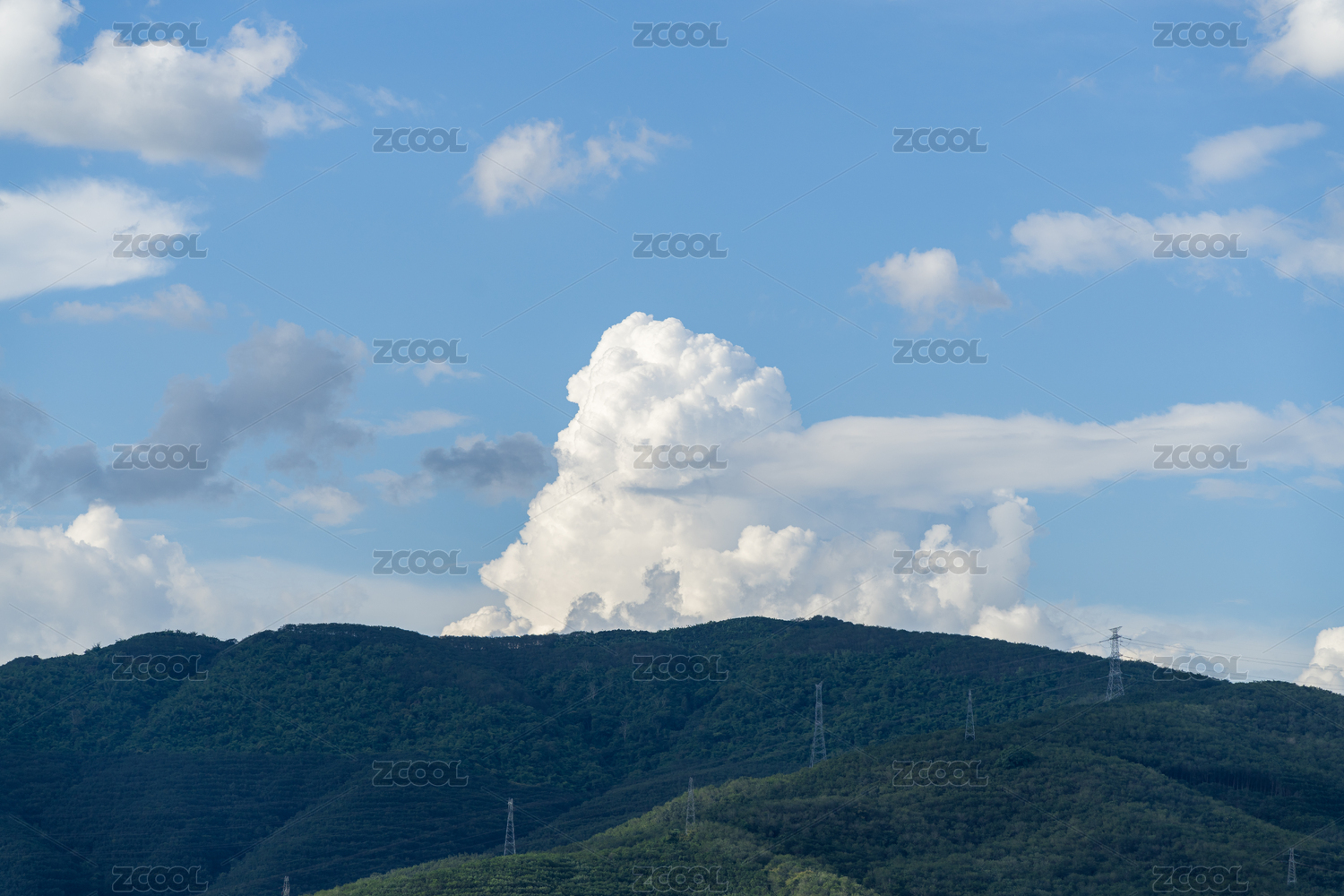 电力塔,蓝天,白云,山峦,输电,铁塔,绿色,山脉,天空,云层