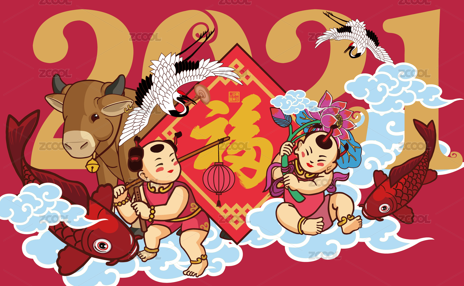 2021牛年新年春节矢量国潮插画