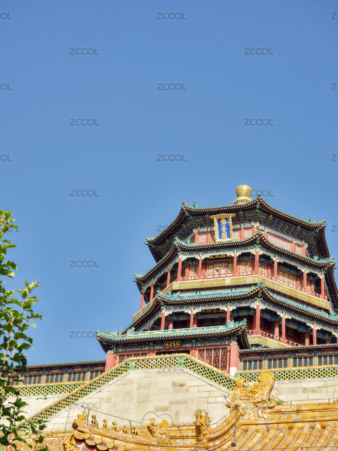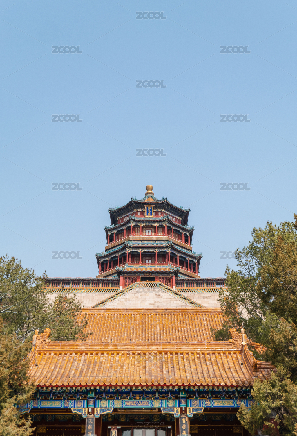 颐和园,佛香阁,建筑,古建筑,红色,绿色,黄色,屋顶,树木,天空