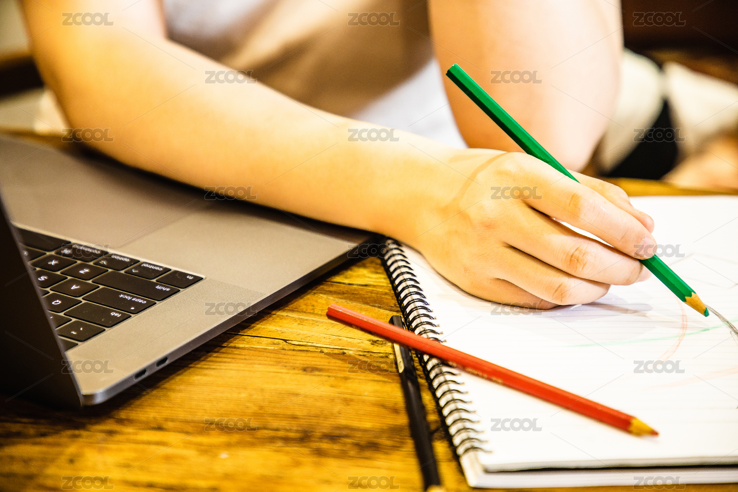 特写女性在摆放着笔记本电脑和本子的工作上拿着铅笔绘画,