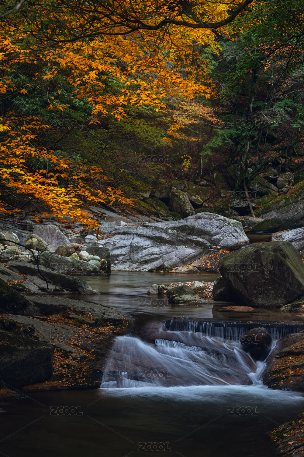 山涧美丽的红叶和落叶自然风光