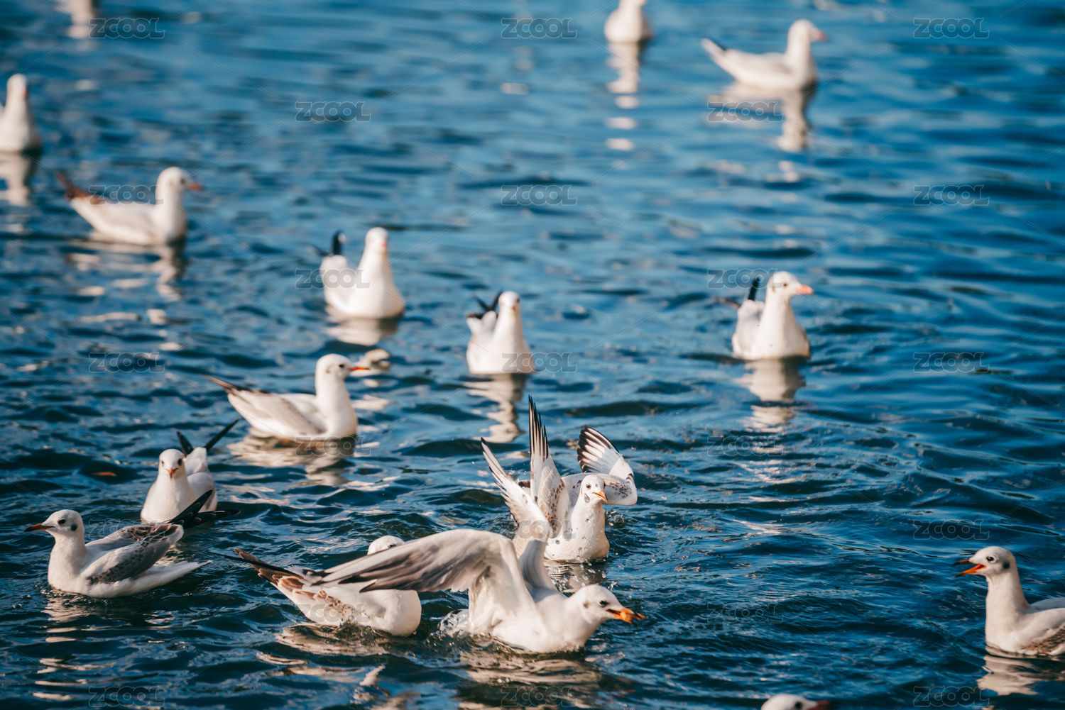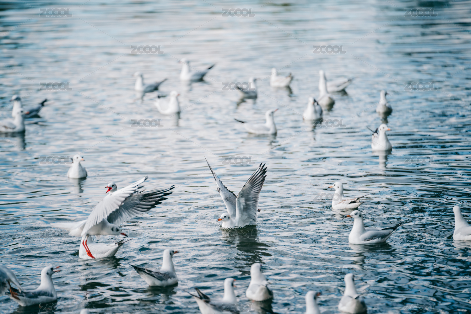 冬天水面嬉戏抢食的红嘴鸥