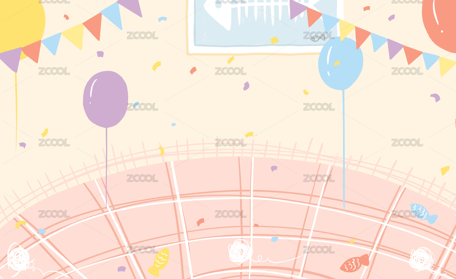 布置了气球吊旗的室内场景 卡通手绘插画