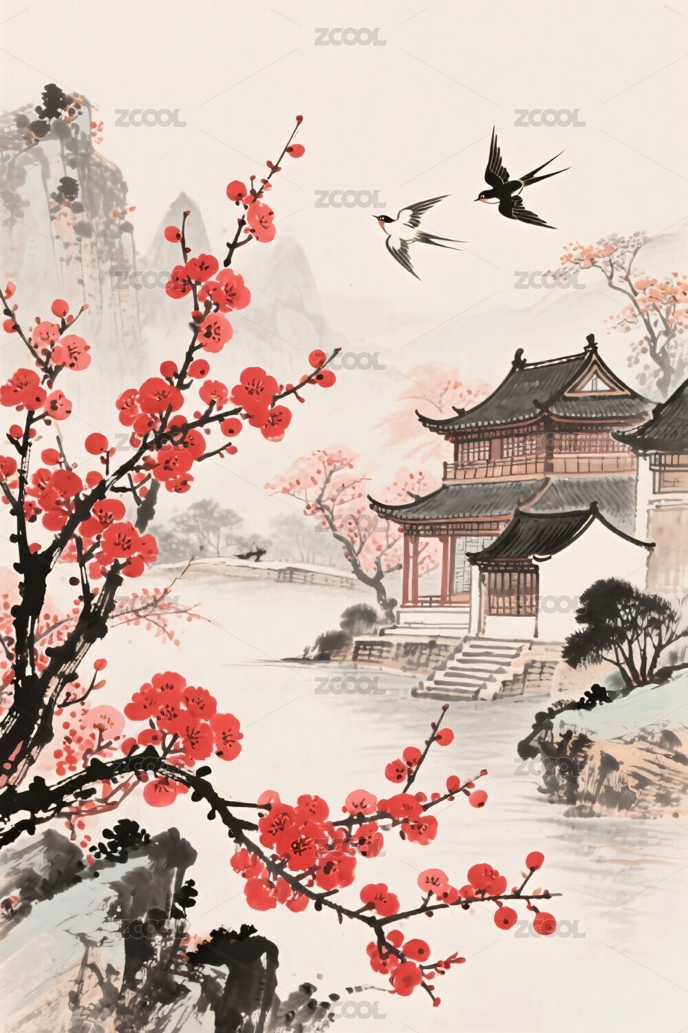 燕子,梅花,山水,树木,水墨,中国画,传统艺术,风景,插画,国画