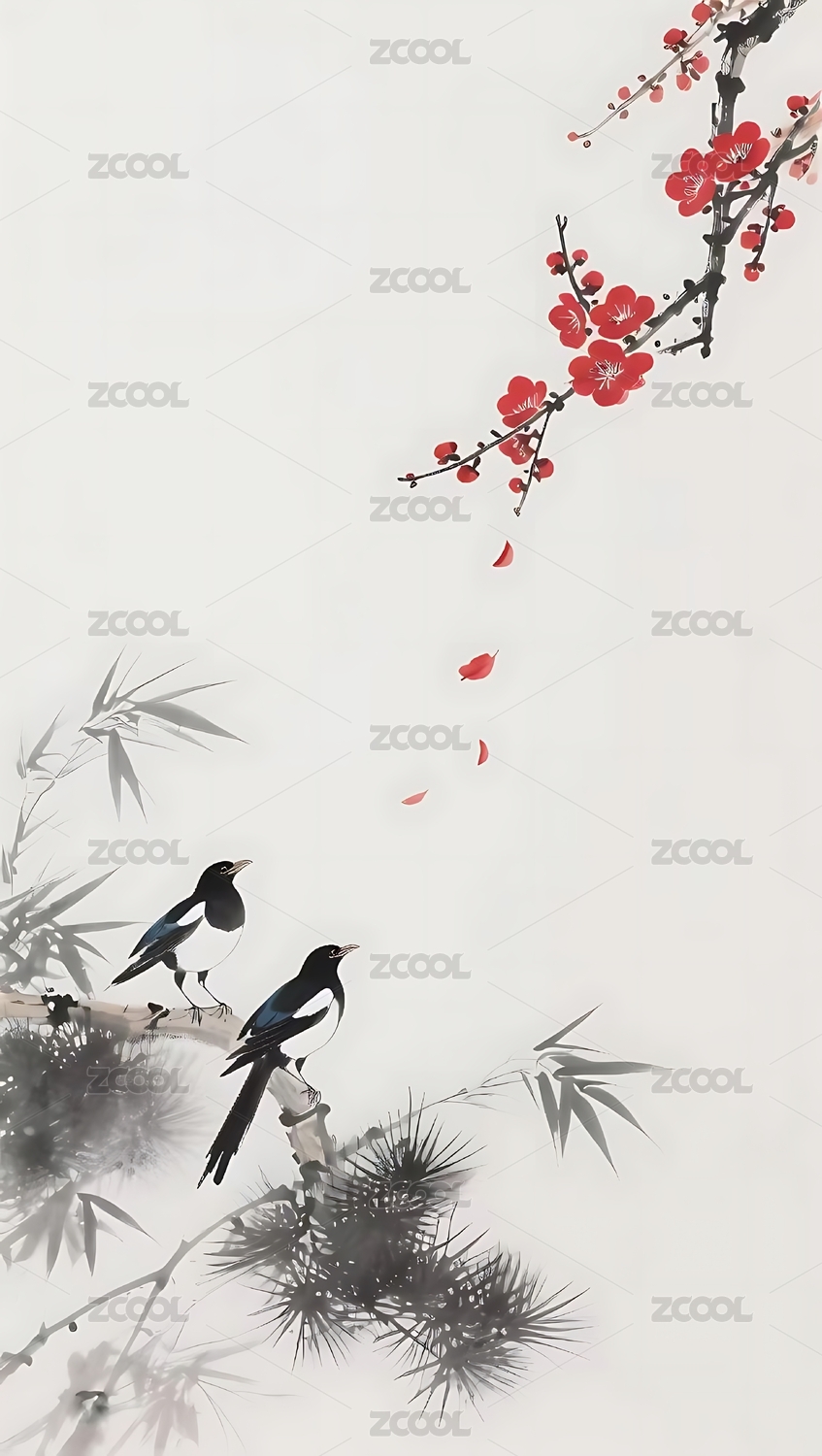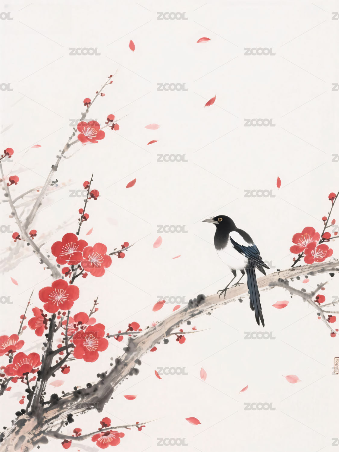 水墨丹青里的红梅与喜鹊