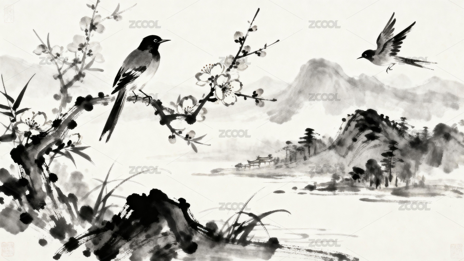 水墨花鸟山水画