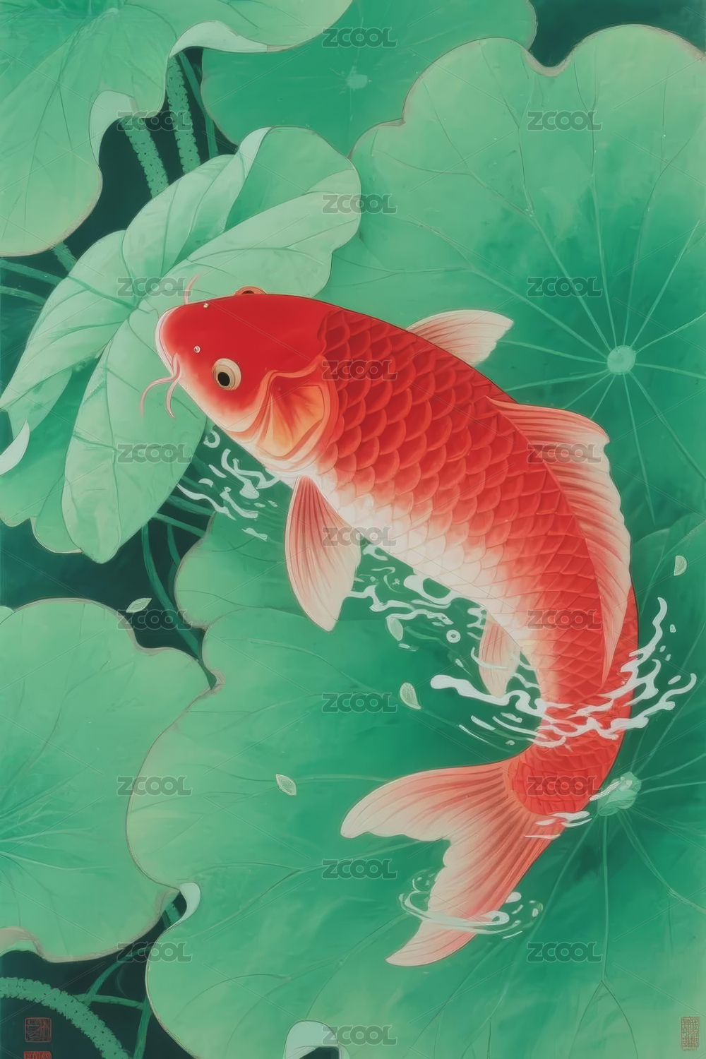 浮世绘动物红色鲤鱼锦鲤吉祥寓意鱼类绘画