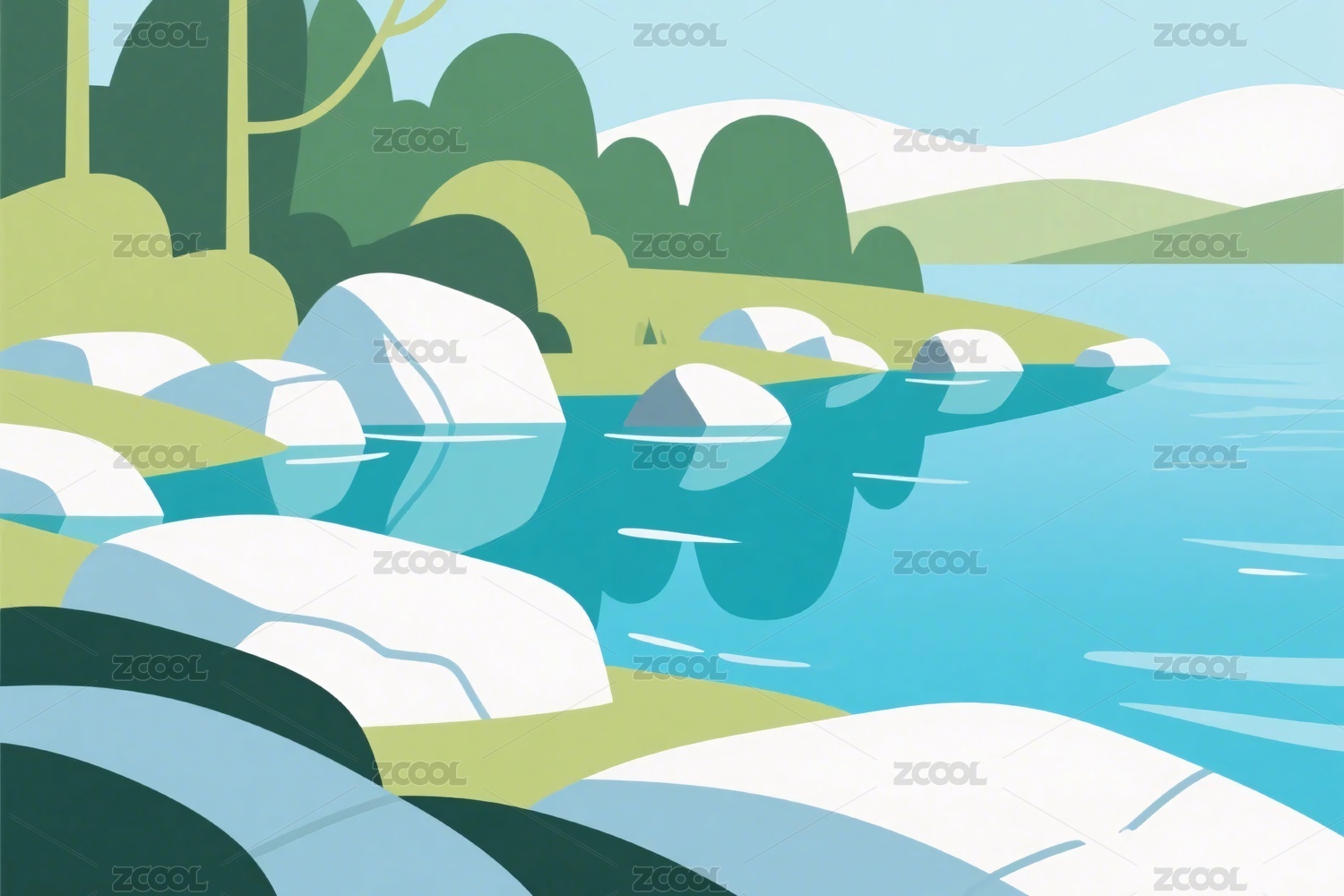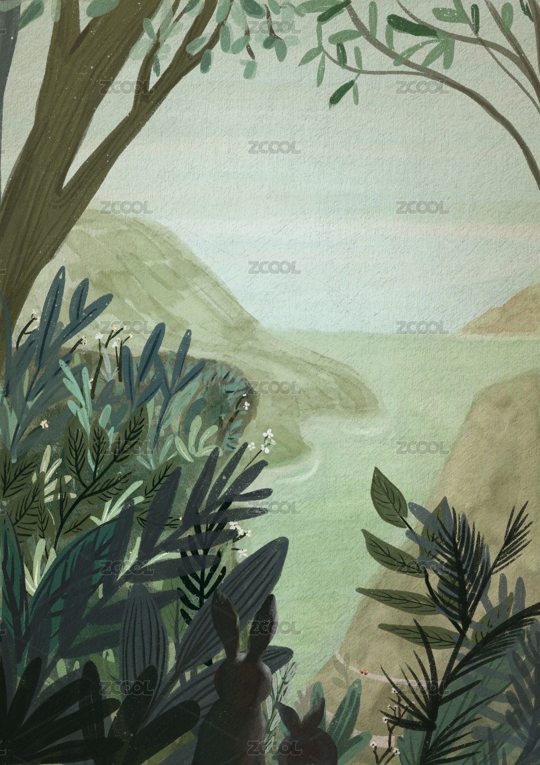 河流,山丘,树木,画册,插画,风景,自然,绿植,艺术,背景