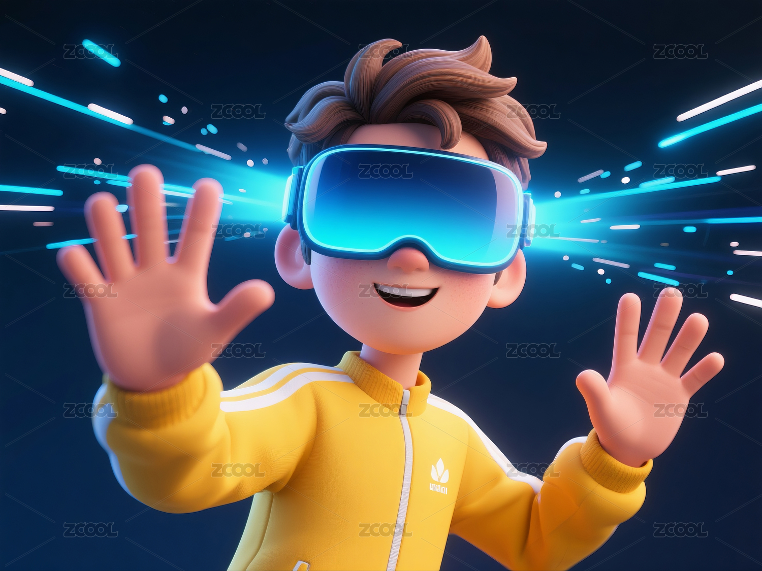 客厅里戴着VR眼镜手拿游戏手柄的男孩3D