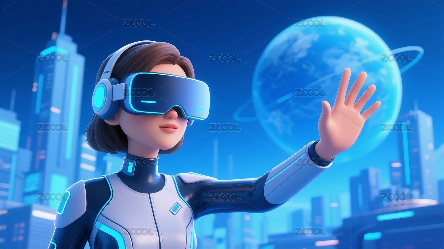男子室内带科幻全息vr眼镜的3d卡通插画