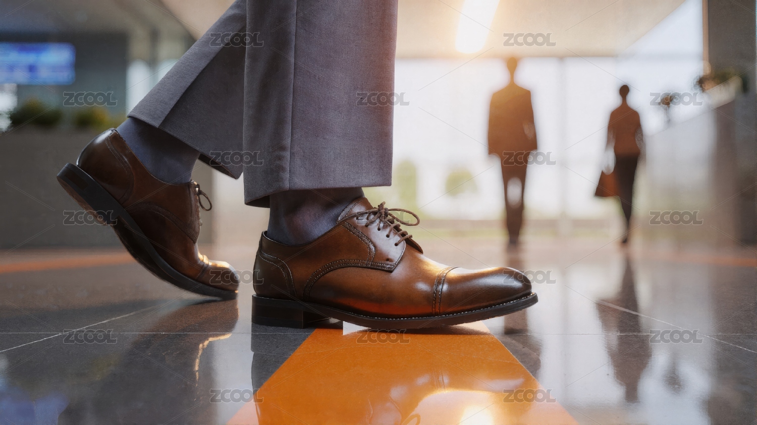 在木地板上穿着皮鞋和彩色袜子的两只脚