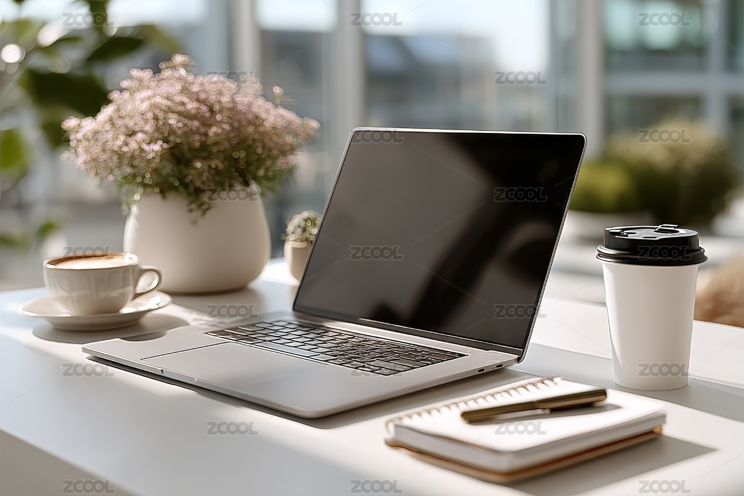 笔记本,电脑,咖啡杯,笔,桌面,灰色,白色,黑色,方形,圆形