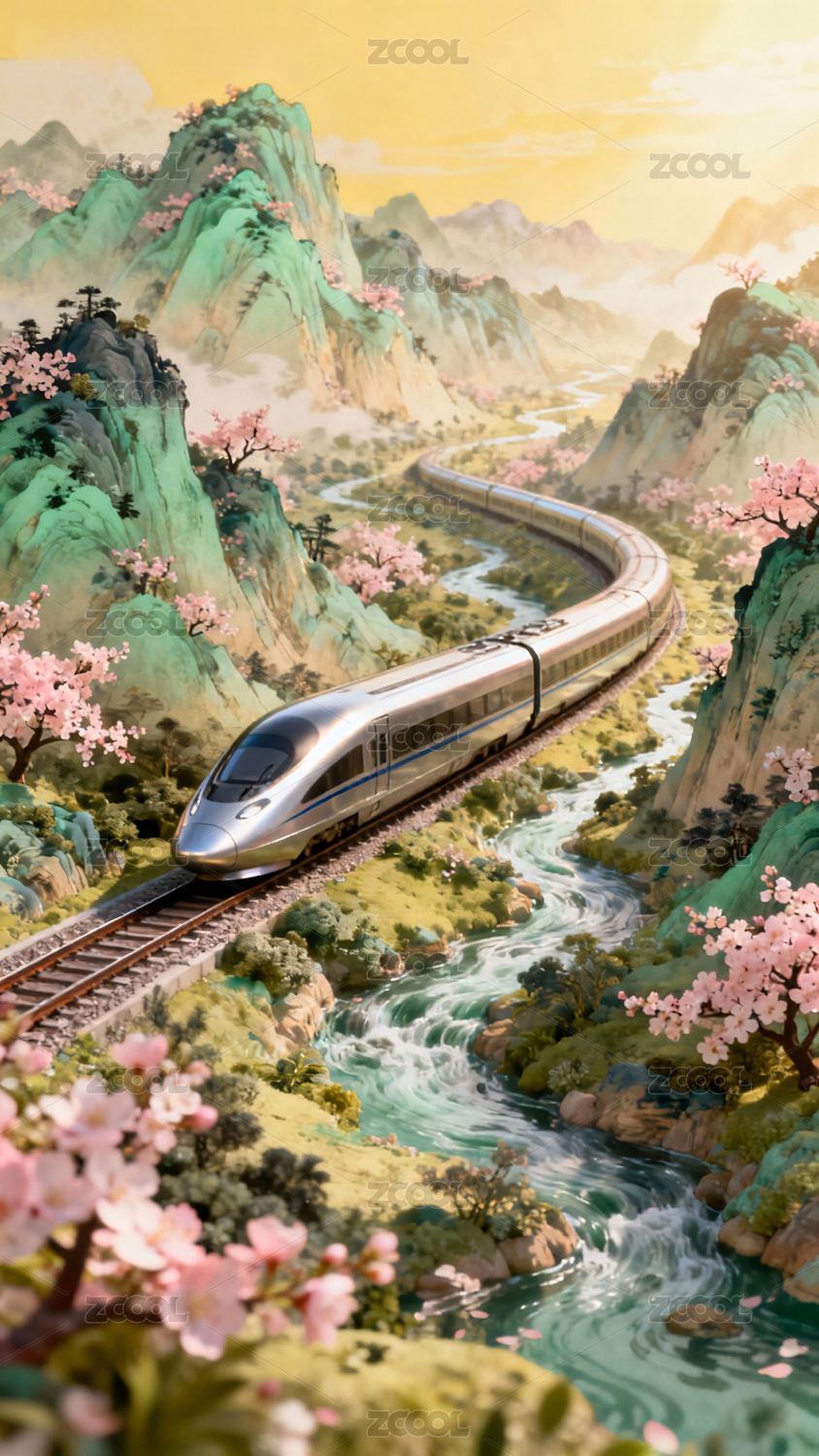 高铁,山水,樱花,春天,列车,自然风光,山脉,河流,盛开,旅行