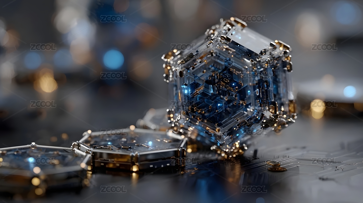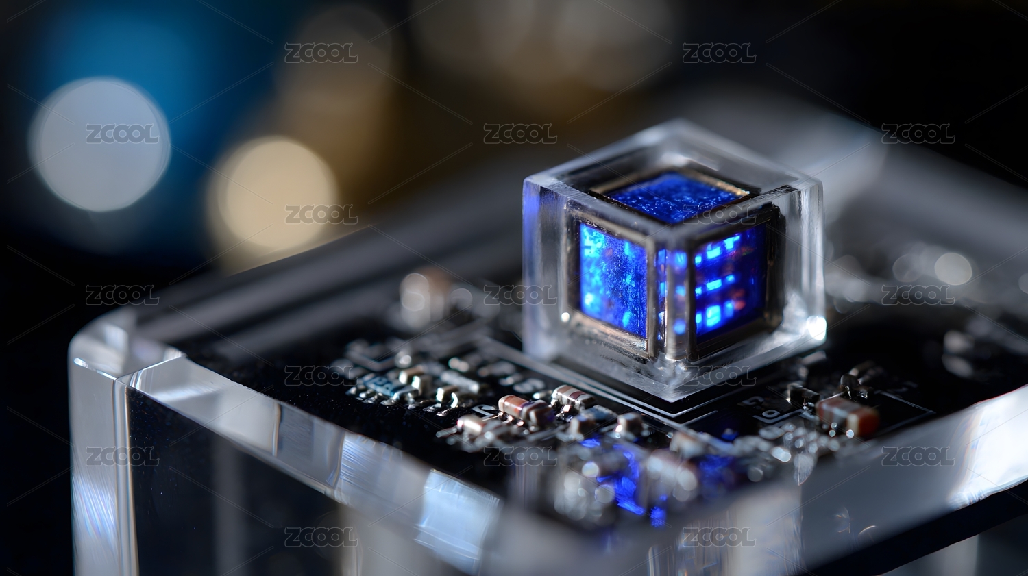 透明立方体芯片嵌入电路板的未来科技场景