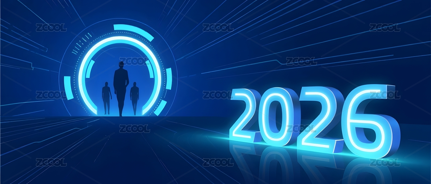 蓝色背景里的线条人形机器人和2026