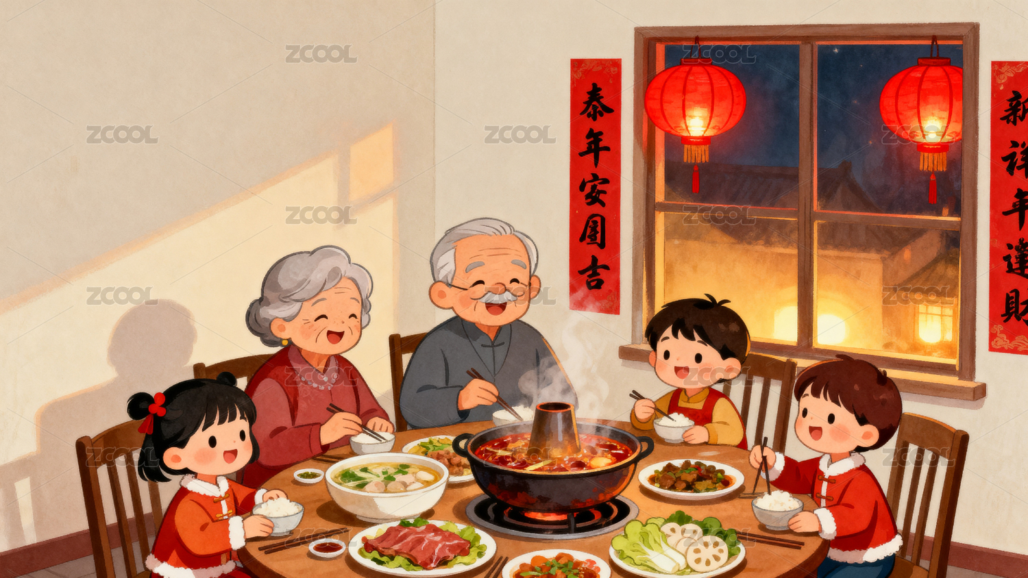 火锅,菜肴,红色,老人,团圆,热气,传统,筷子,福字,小孩