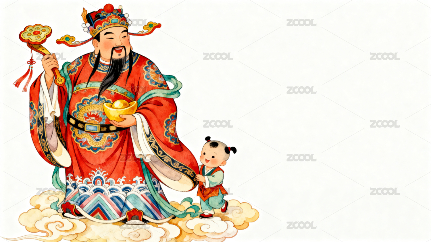 财神爷怀抱孩童手持金元宝