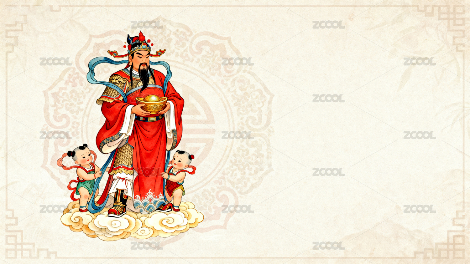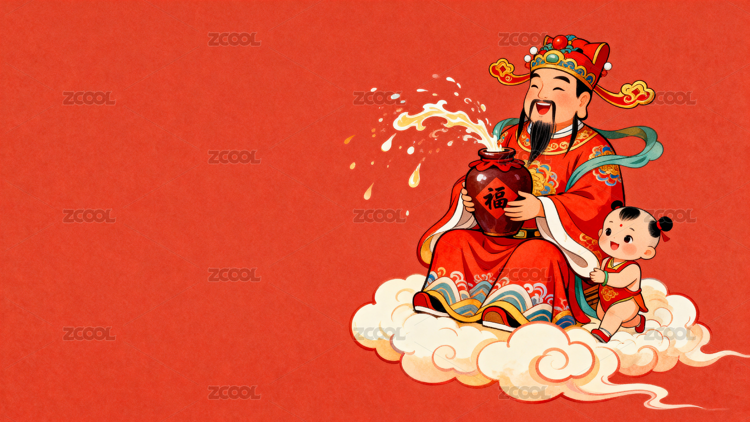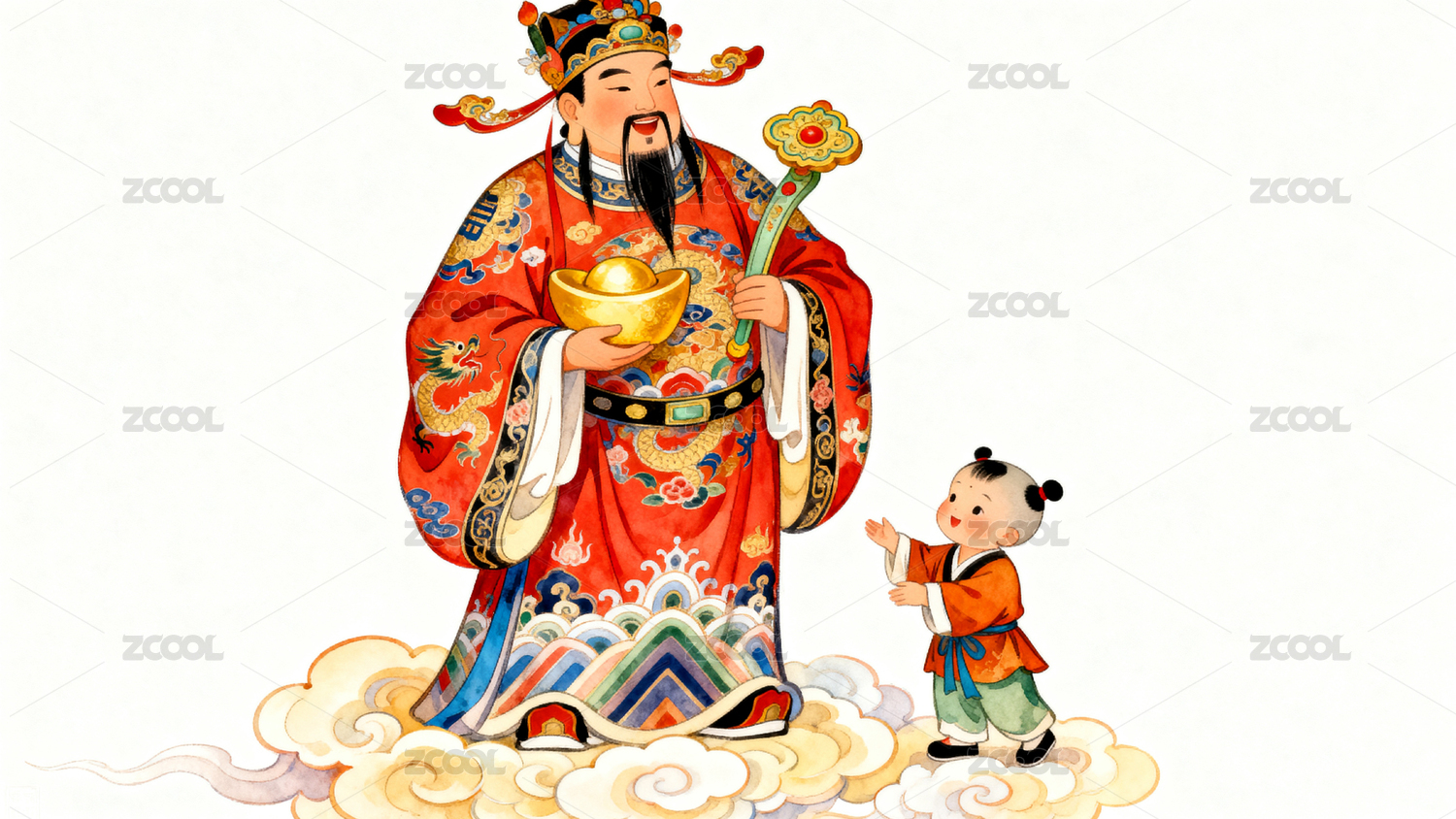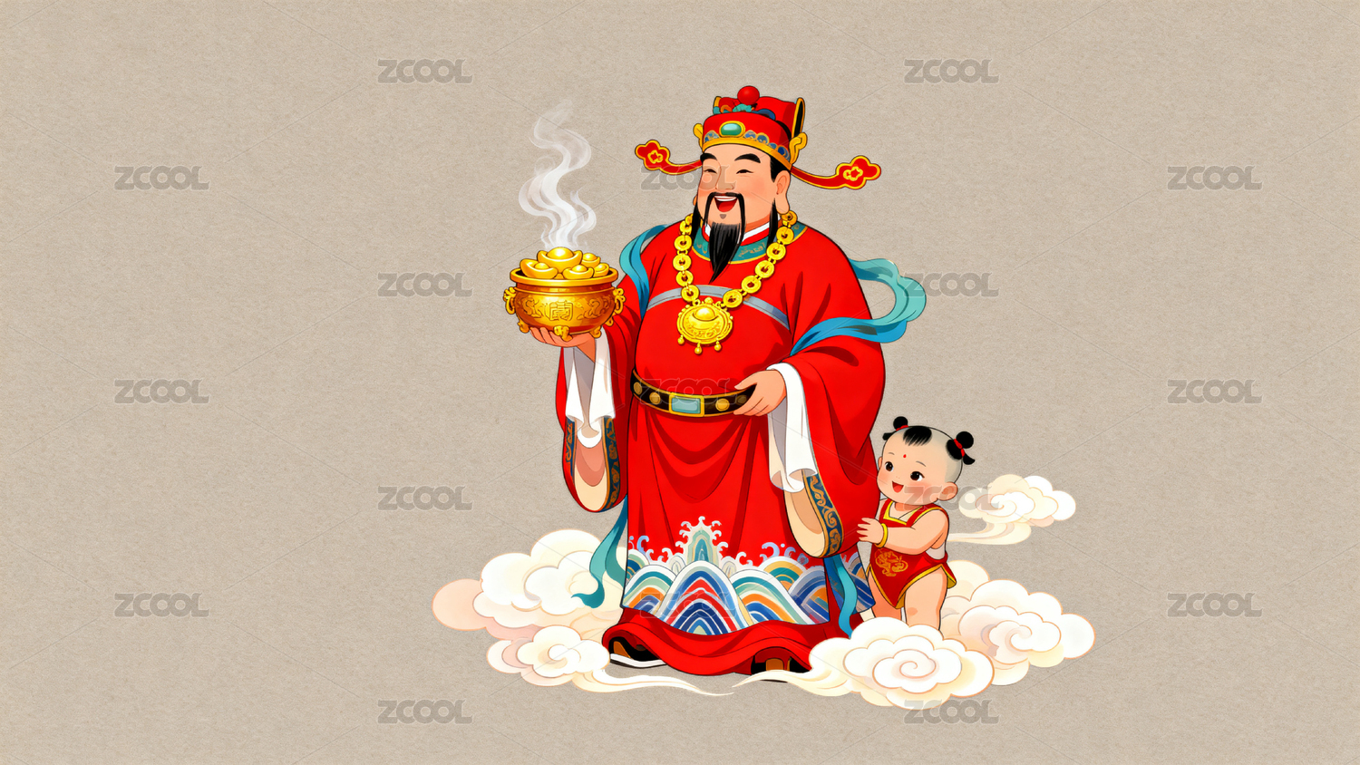 财神爷怀抱孩童云端祥瑞