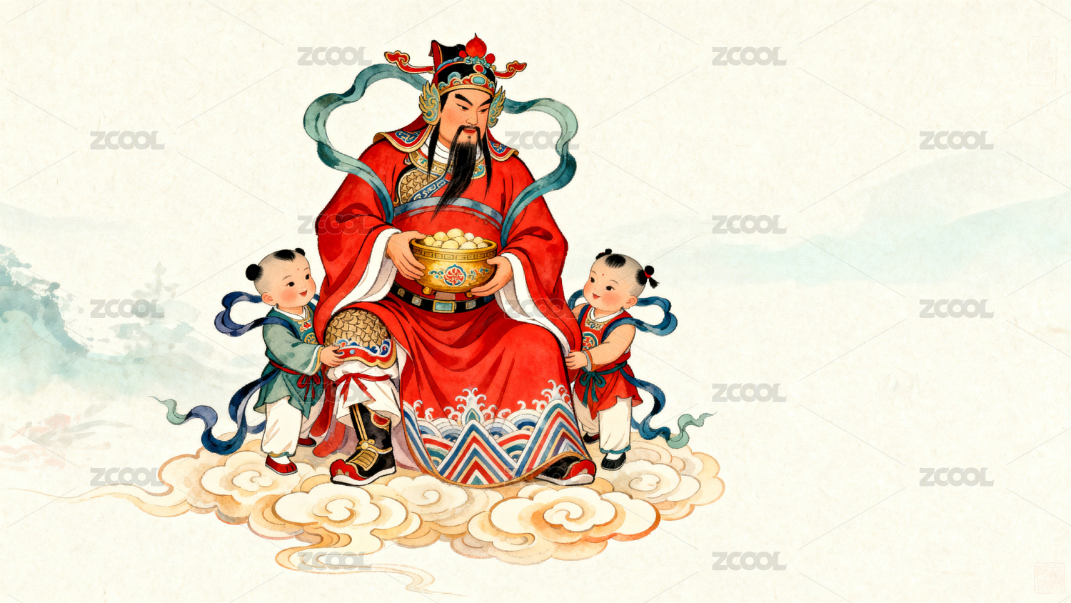 古代神祇与孩童云端祥瑞图