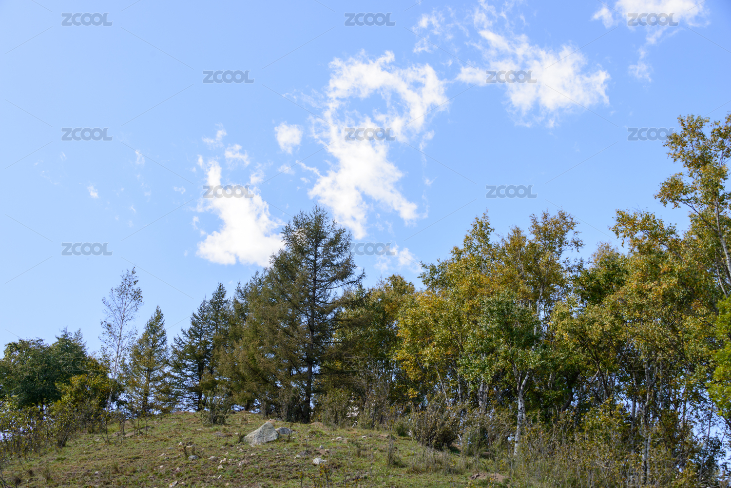 山蓝天白云下阿尔山秋天森林里树木自然风景