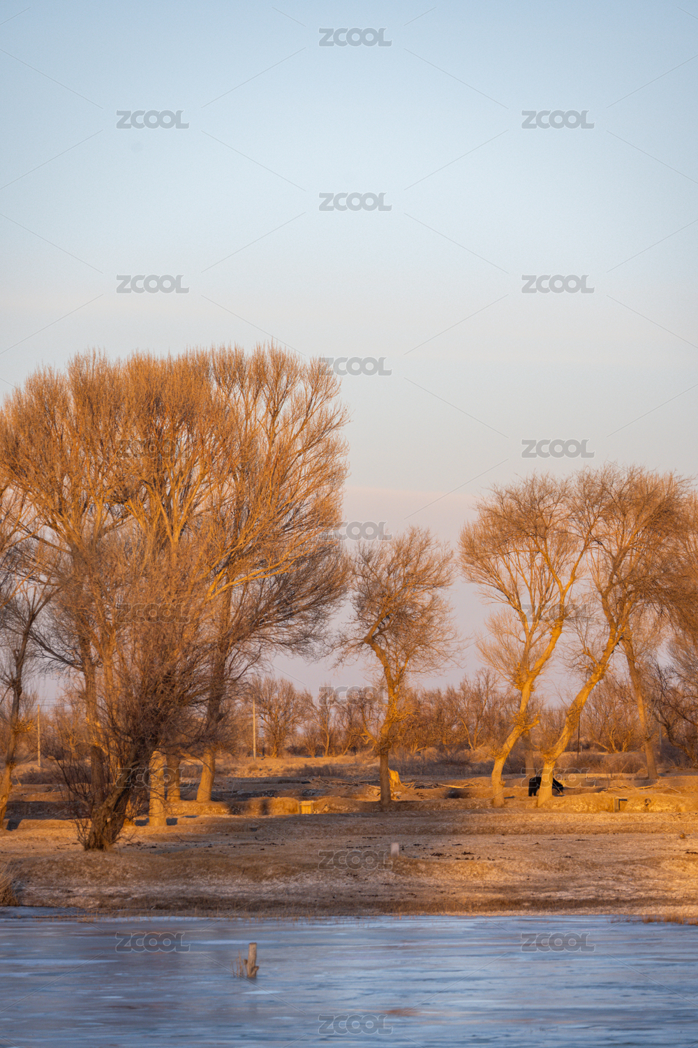 冬季西北甘肃黄昏下的湖畔树林