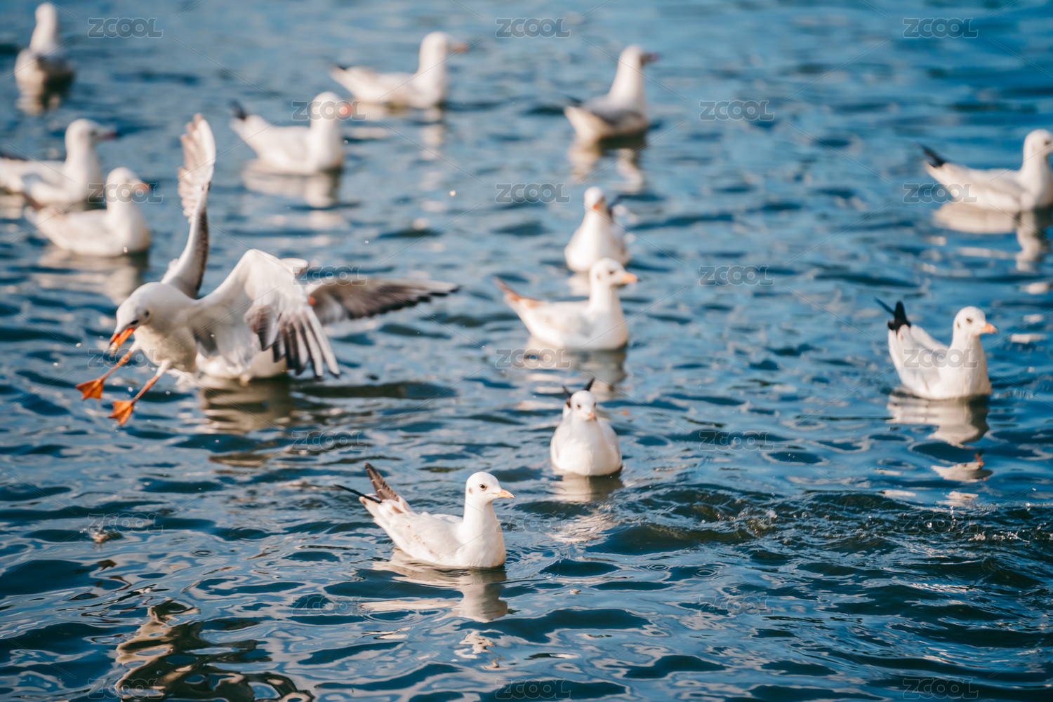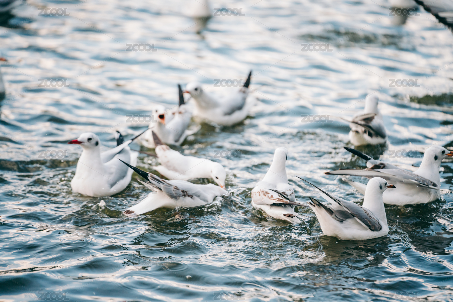 海鸥在海面上自由飞翔追逐觅食嬉戏特写