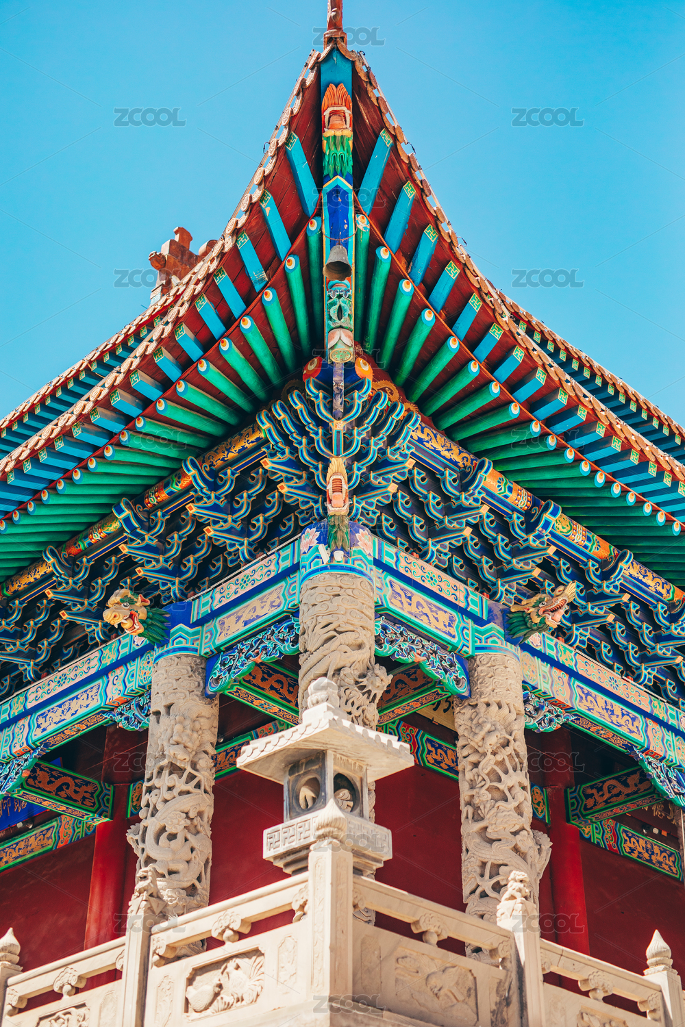 梅山寺宝殿上彩绘斗拱建筑外部景观