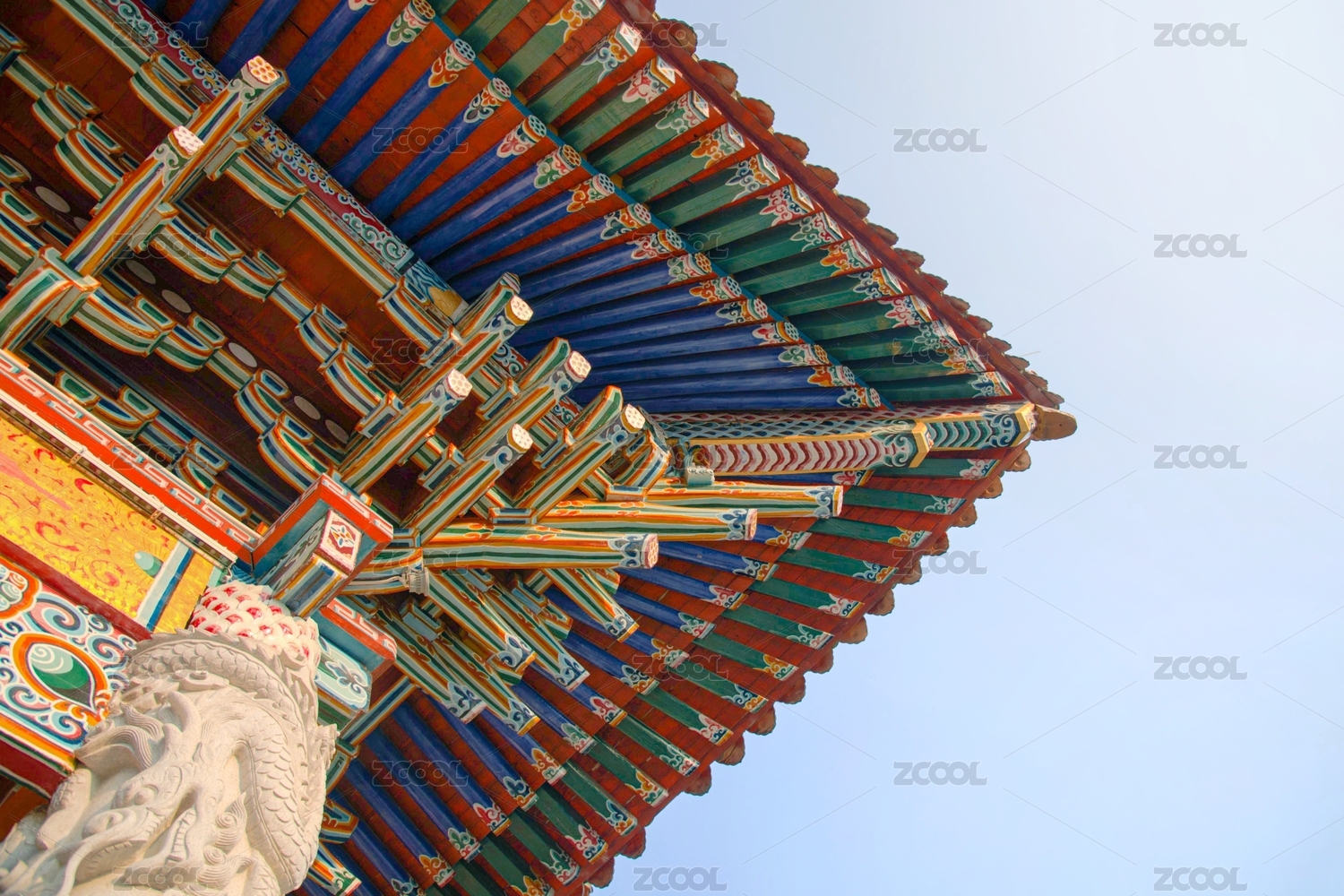 蓝天白云下大殿飞檐翘角,中国山东省寿光市宁国寺