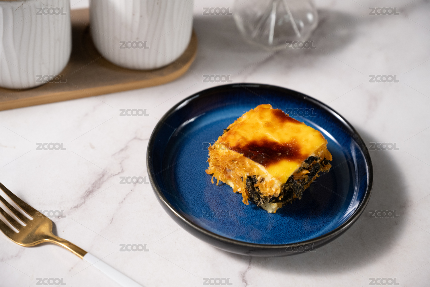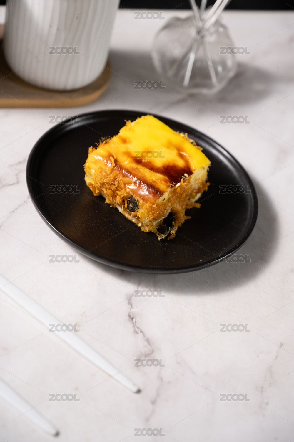 桌面上的盘子里的美味可口的芝士肉松蛋糕
