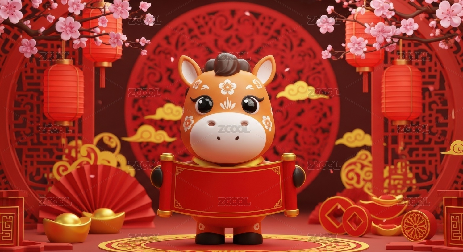 卡通骏马国潮风新春商业主视觉场景