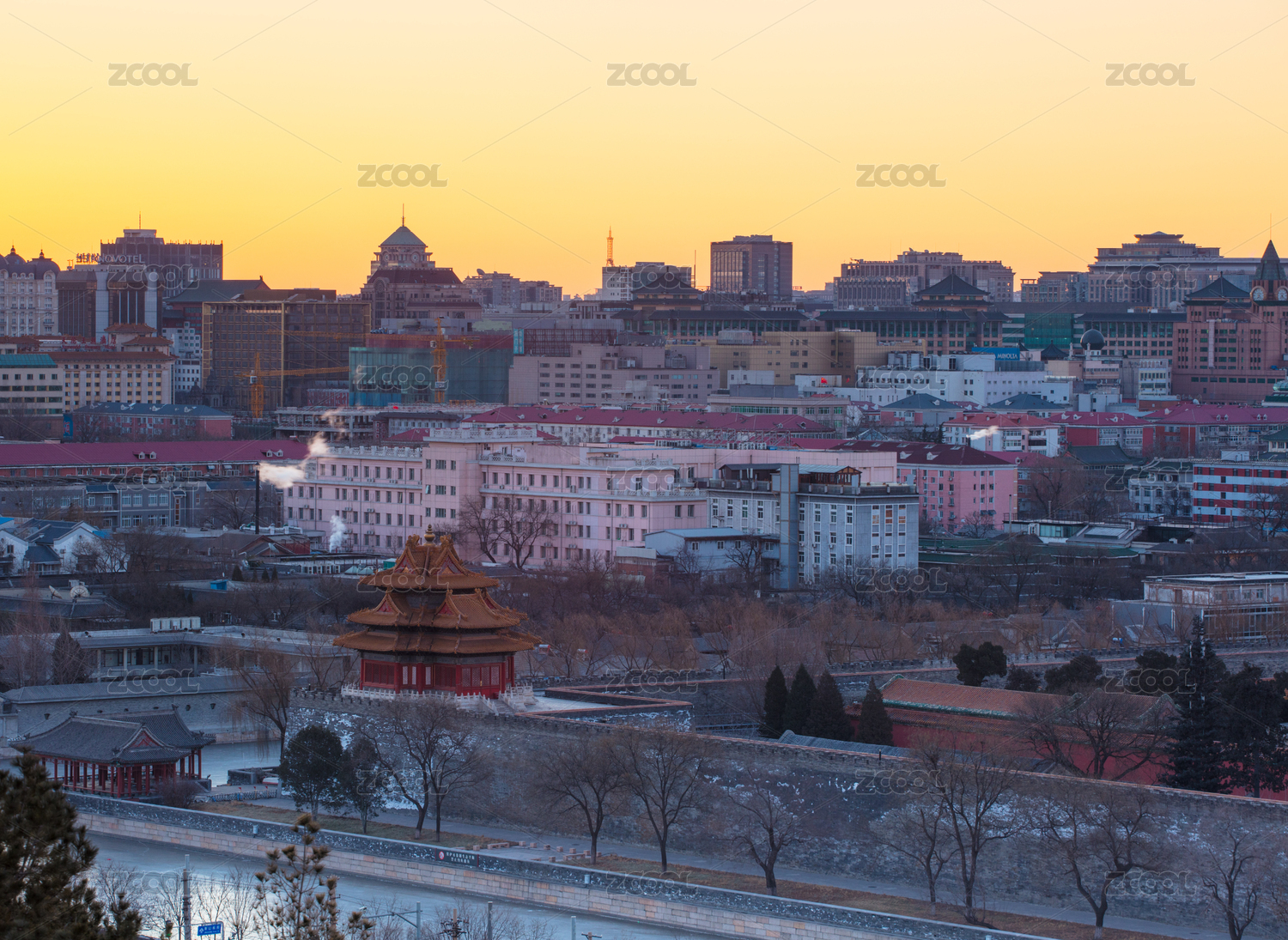 北京景山公园俯瞰故宫角楼 城市天际线黄昏