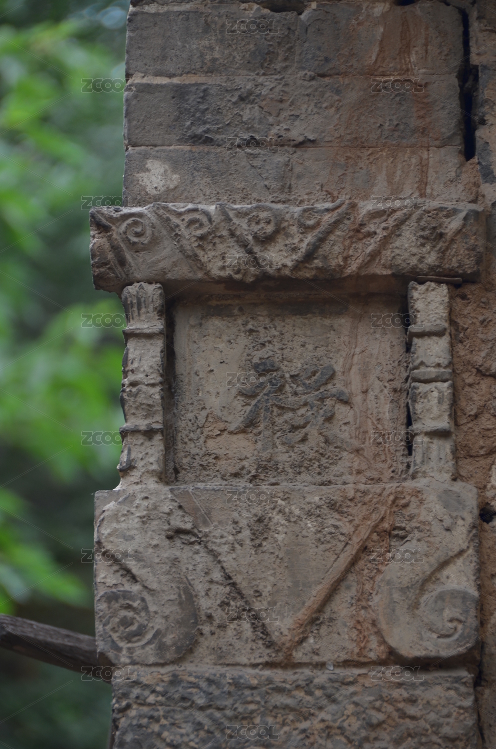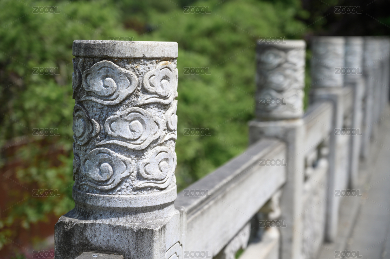 寺庙长廊上祥云图案的石头墩子特写氧化掉色