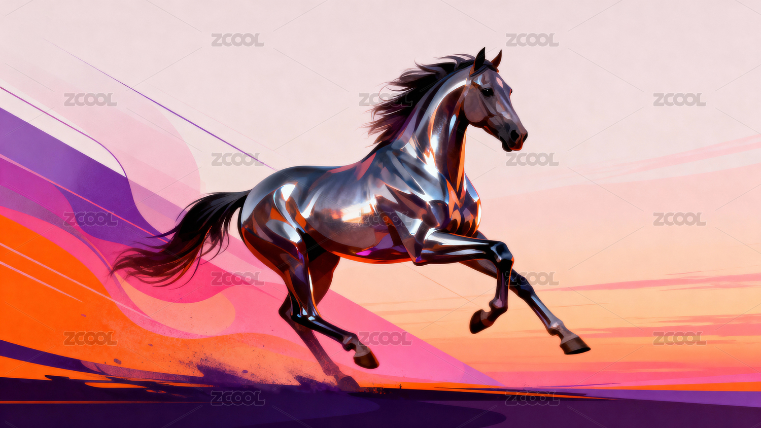 金属质感骏马奔腾于梦幻背景
