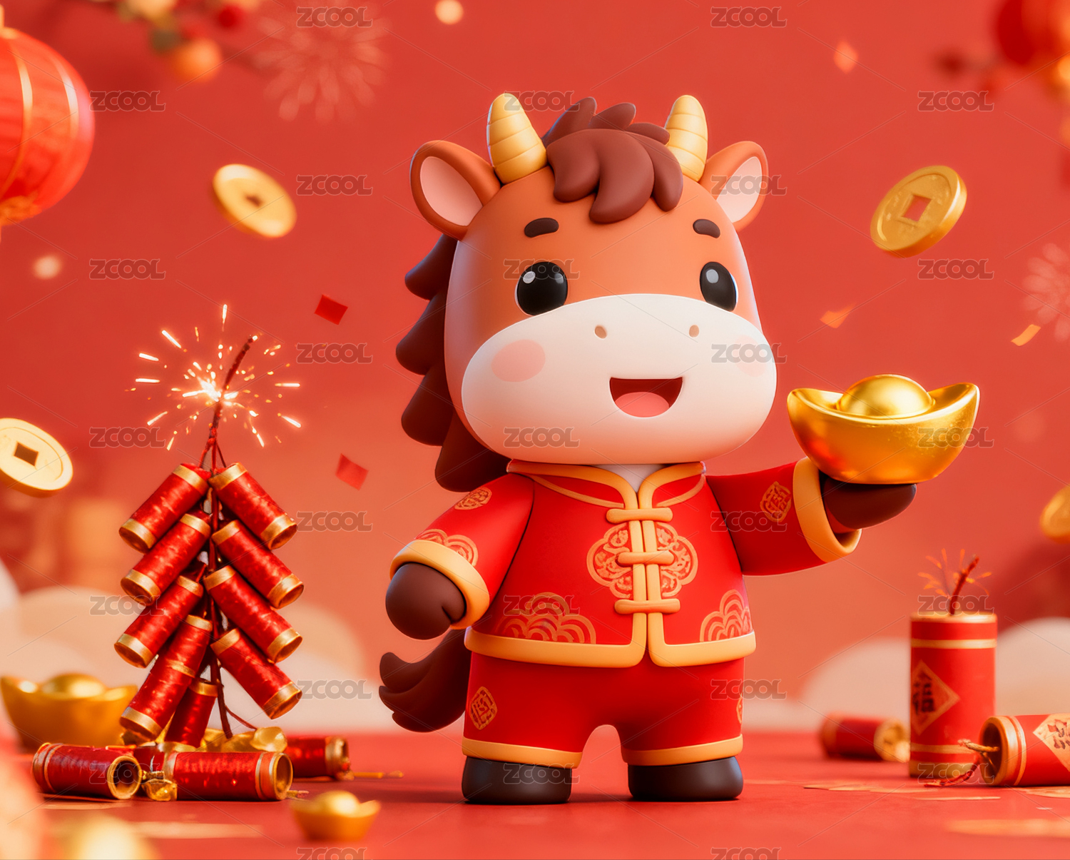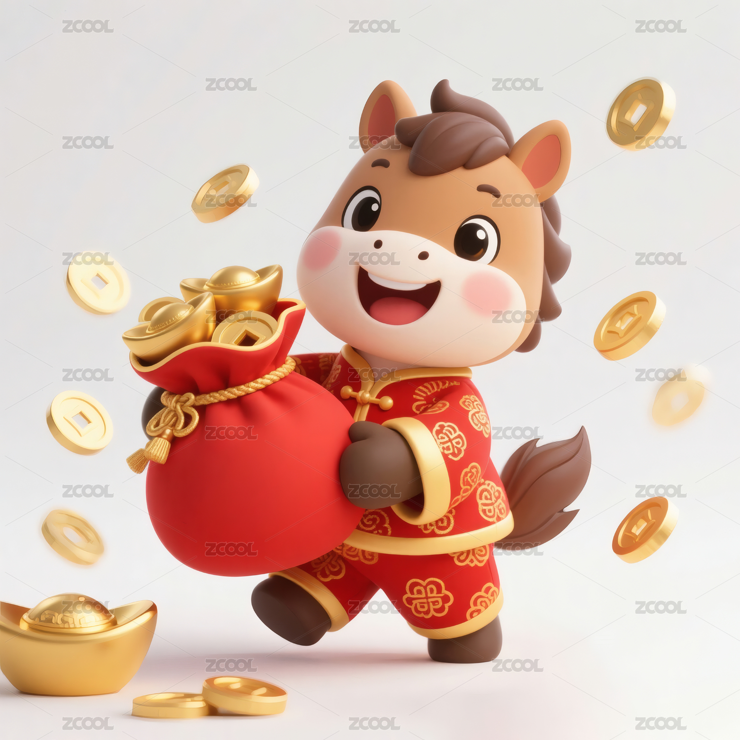 卡通Q版马年财神抱着金元宝喜庆招财生肖形