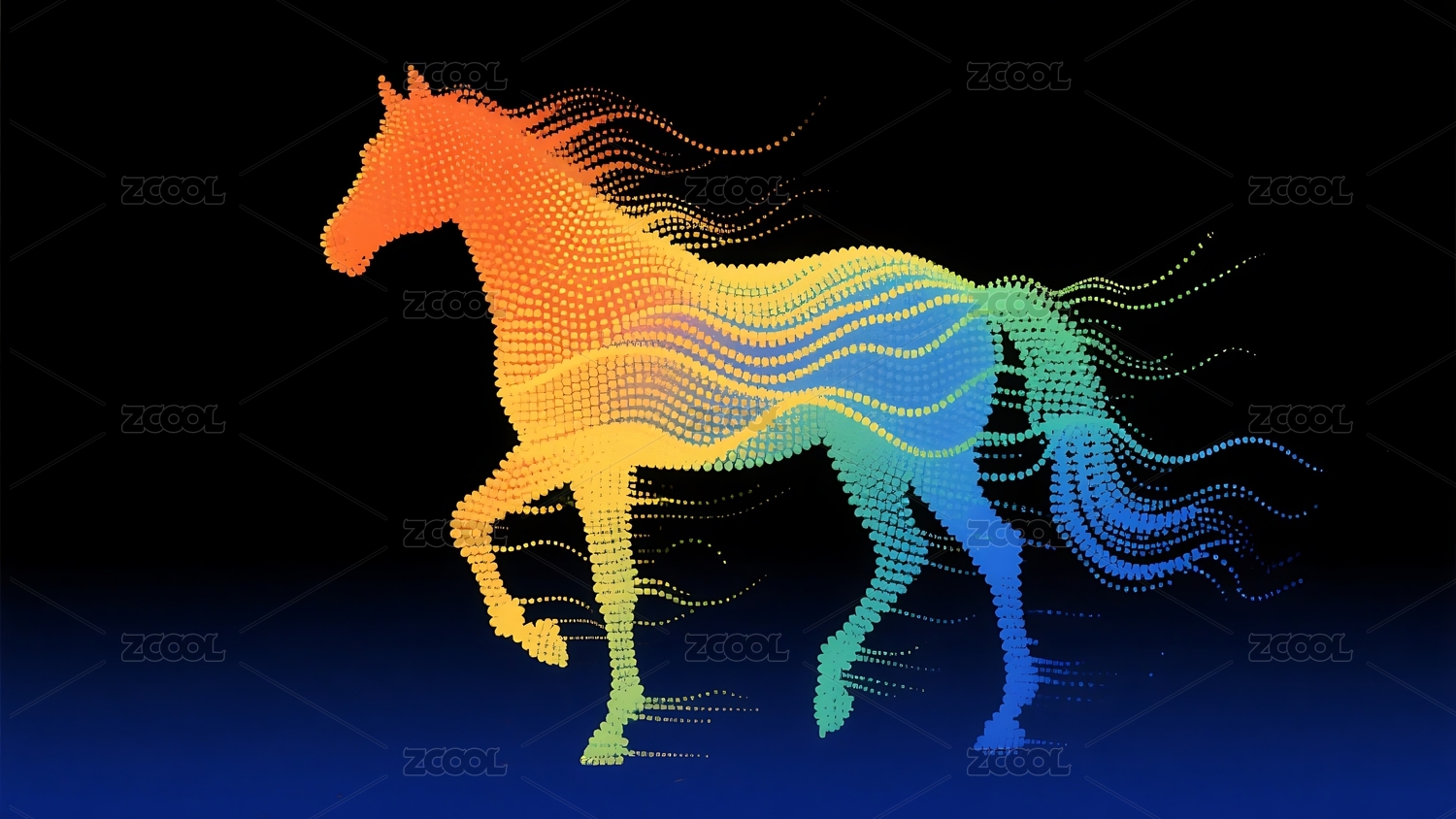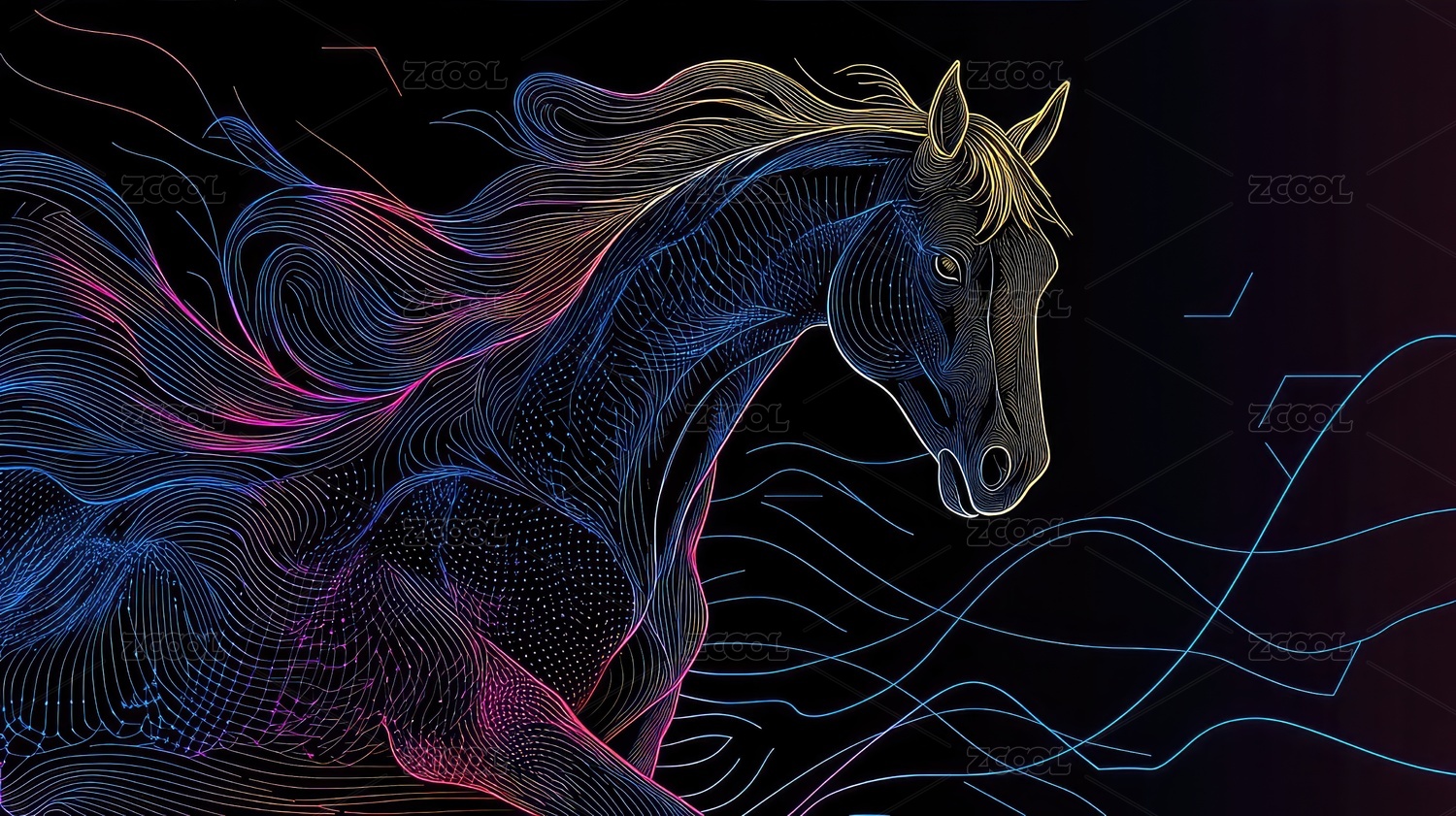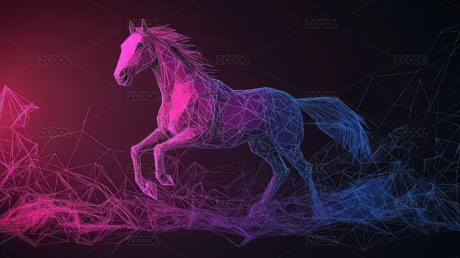抽象蓝紫色几何线条绘制奔跑的马匹