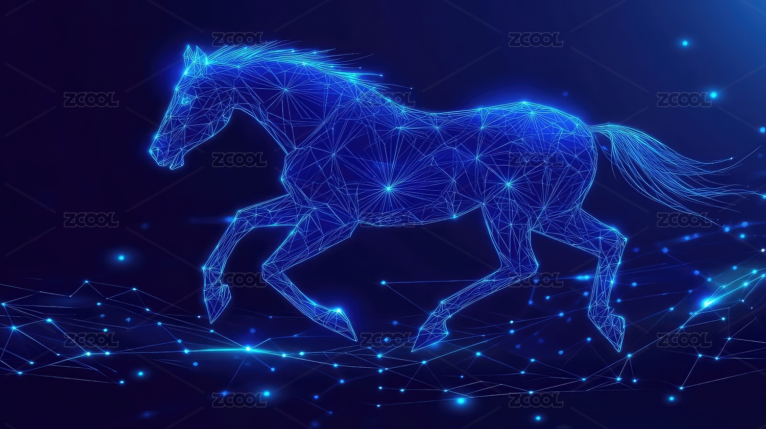 蓝色线条勾勒的奔跑的马图像科技感十足