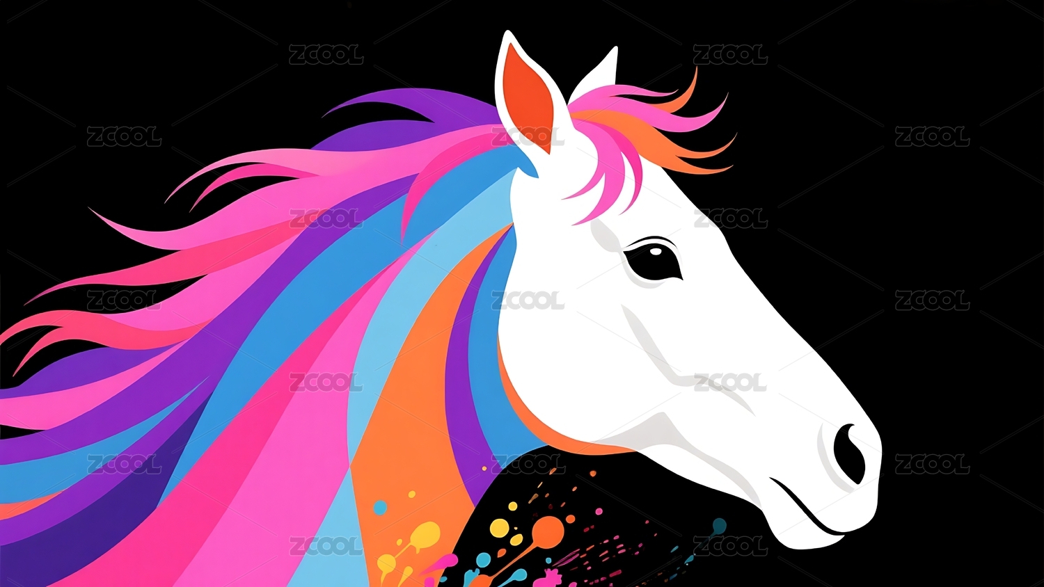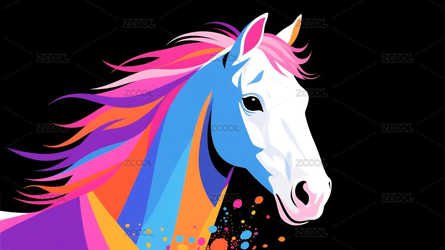 抽象风格的骏马侧影色彩斑斓背景漆黑