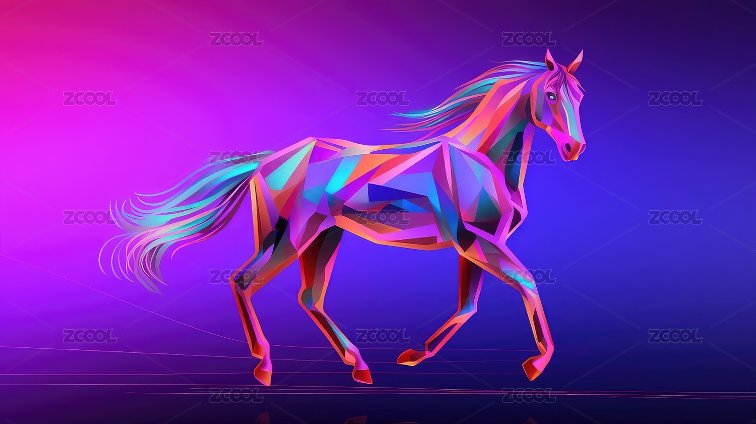 彩虹几何风格马在紫蓝背景中奔跑