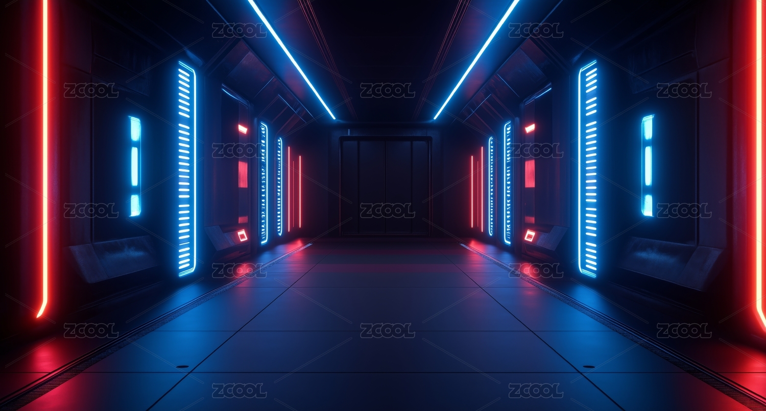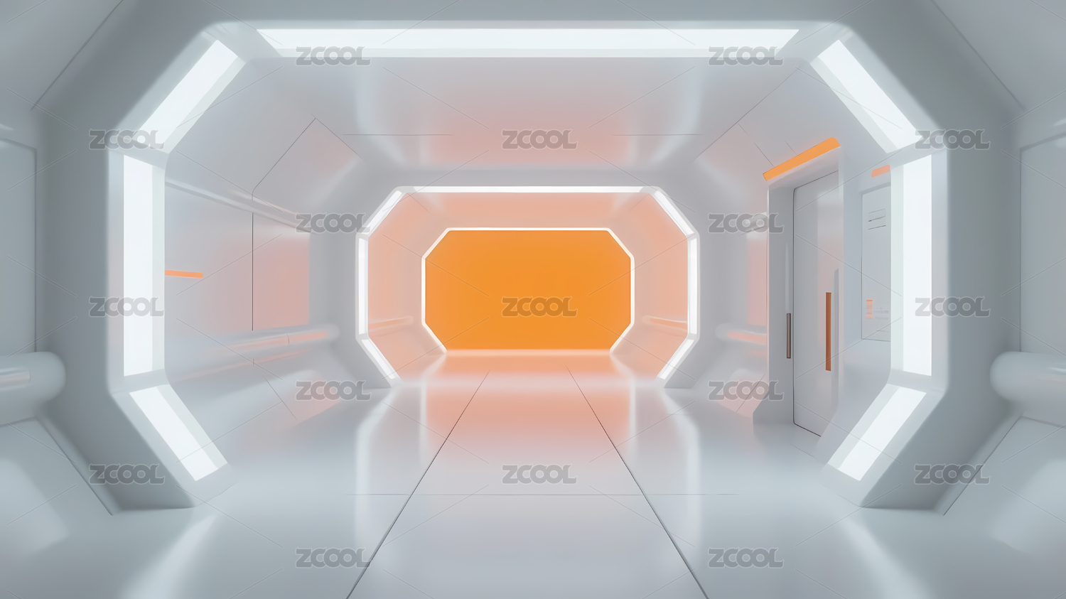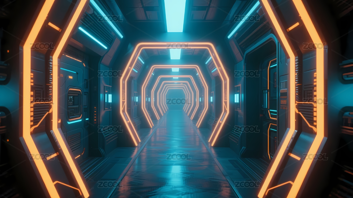 科技,未来,蓝色,橙色,霓虹灯,地面,八边形,门框,冷峻,墙面