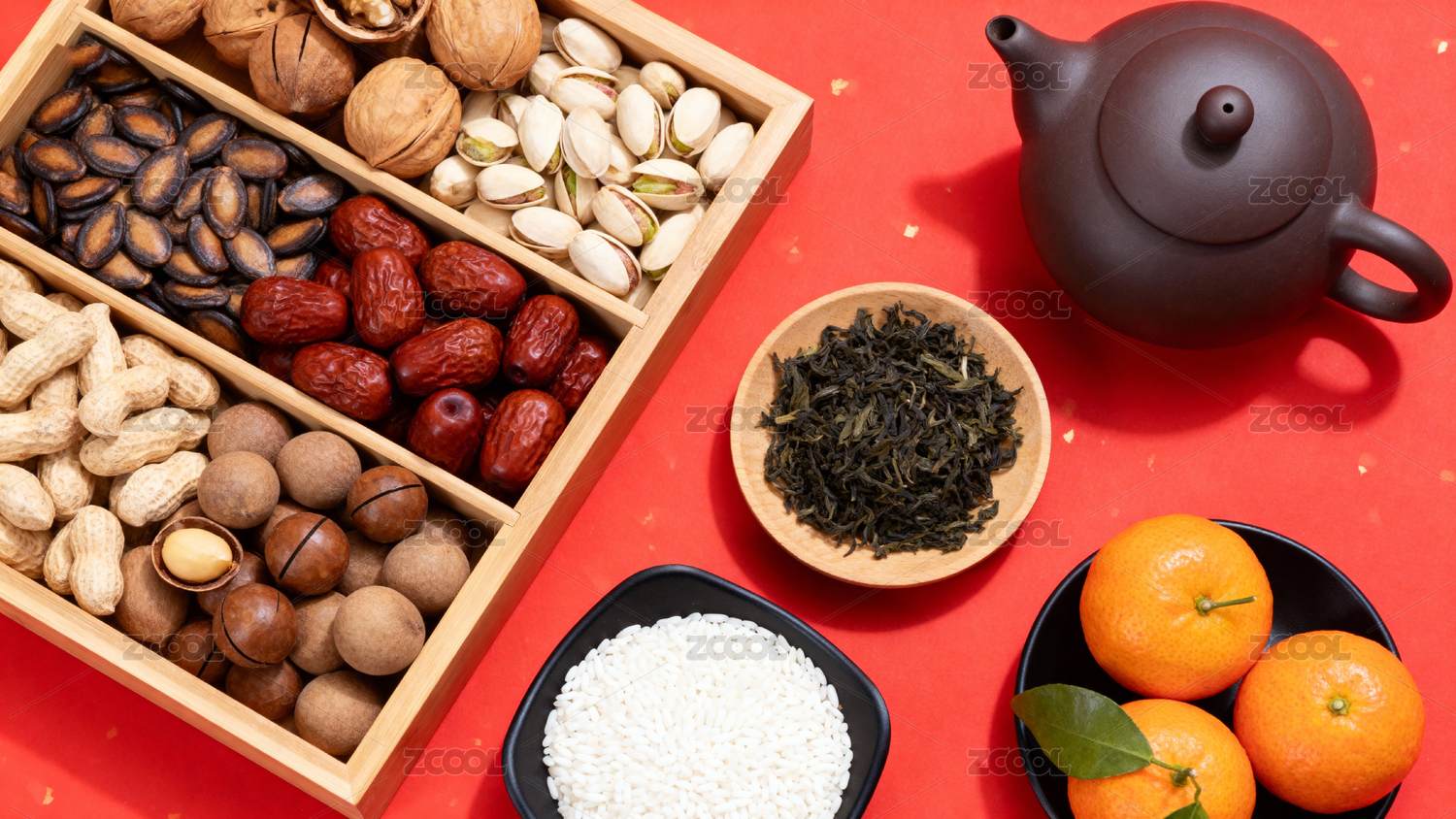 装有坚果的果盒和碗装有的食品及茶具一同放在红色背景上